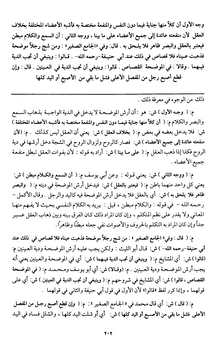 قال: وفي " الجامع الصغير ": ومن شج رجلا موضحة فذهبت عيناه فلا قصاص في ذلك عند أبي حنيفة - رَحِمَهُ اللَّهُ -. قالوا: وينبغي أن تجب الدية فيهما. وقالا: في الموضحة القصاص. قالوا: وينبغي أن تجب الدية في العينين. قال: وإن قطع أصبع رجل من المفصل الأعلى فشل ما بقي من الأصبع أو اليد كلها