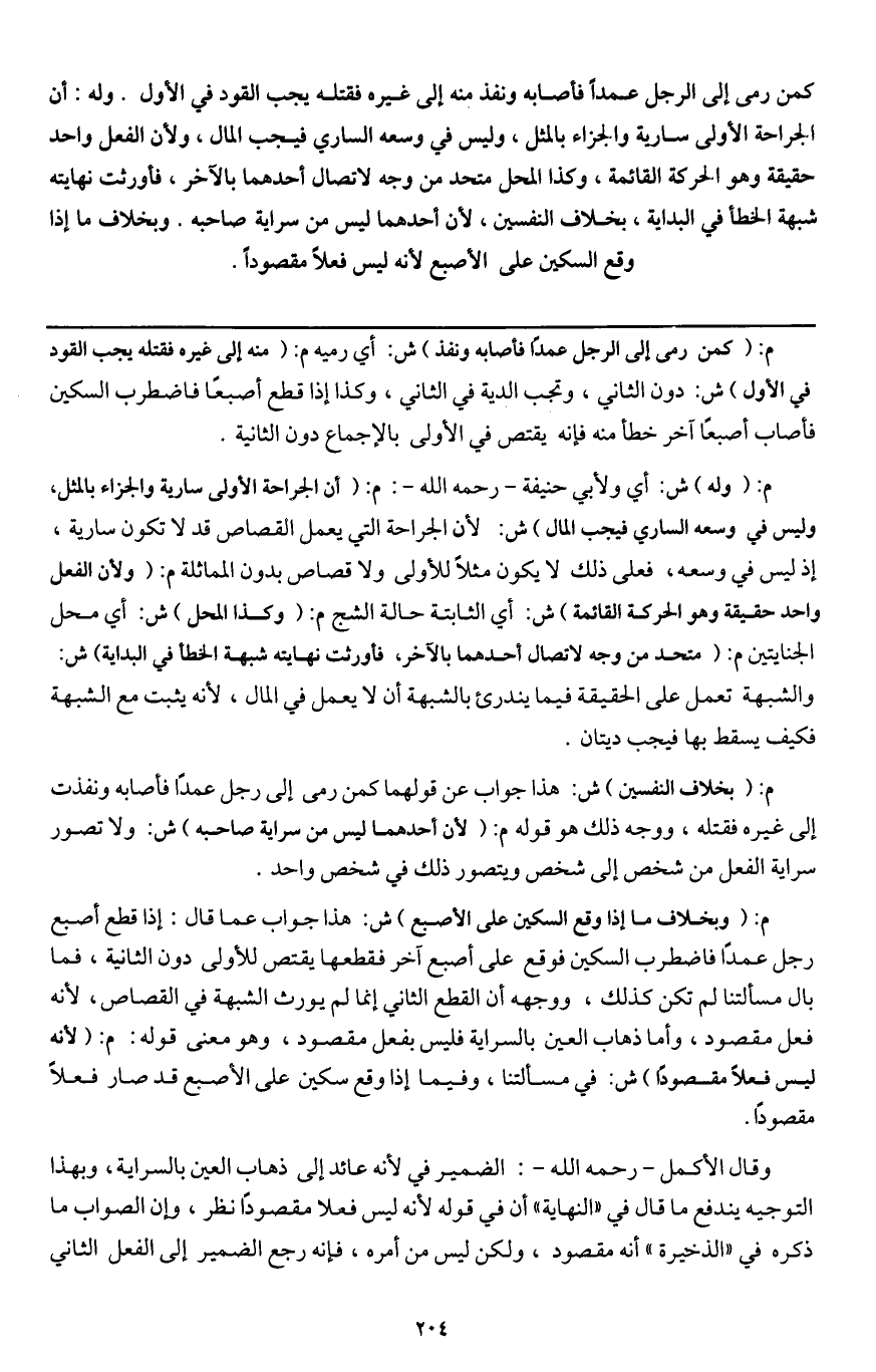 ـــــــــــــــــــــــــــــQم: (كمن رمى إلى الرجل عمدا فأصابه ونفذ) ش: أي رميه م: (منه إلى غيره فقتله يجب القود في الأول) ش: دون الثاني، وتجب الدية في الثاني، وكذا إذا قطع أصبعا فاضطرب السكين فأصاب أصبعا آخر خطأ منه فإنه يقتص في الأولى بالإجماع دون الثانية.