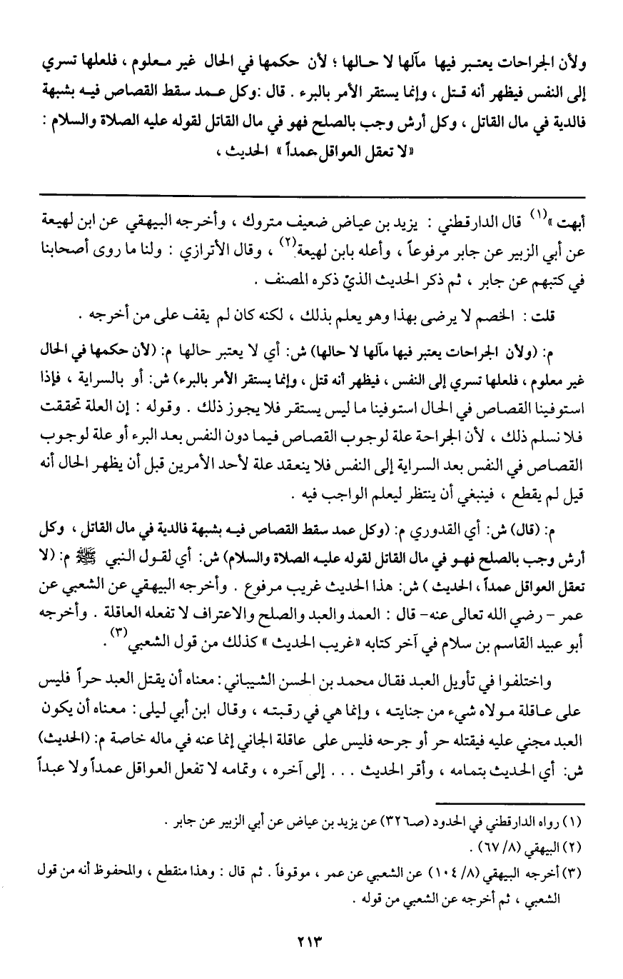 واختلفوا في تأويل العبد فقال محمد بن الحسن الشيباني: معناه أن يقتل العبد حرا فليس على عاقلة مولاه شيء من جنايته، وإنما هي في رقبته، وقال ابن أبي ليلى: معناه أن يكون العبد مجني عليه فيقتله حر أو جرحه فليس على عاقلة الجاني إنما عنه في ماله خاصة م: (الحديث) ش: أي الحديث بتمامه، وأقر الحديث. . . إلى آخره، وتمامه «لا تفعل العواقل عمدا ولا عبدا