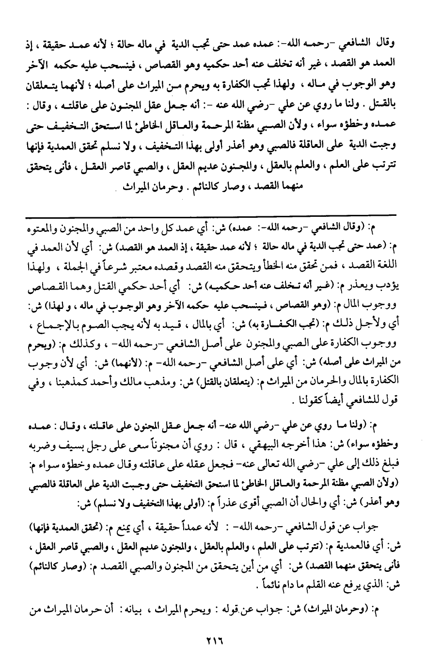 ـــــــــــــــــــــــــــــQم: (وقال الشافعي - رَحِمَهُ اللَّهُ -: عمده) ش: أي عمد كل واحد من الصبي والمجنون والمعتوه م: (عمد حتى تجب الدية في ماله حالة؛ لأنه عمد حقيقة، إذ العمد هو القصد) ش: أي لأن العمد في اللغة القصد، فمن تحقق منه الخطأ ويتحقق منه القصد وقصده معتبر شرعا في الجملة، ولهذا يؤدب ويعذر م: (غير أنه تخلف عنه أحد حكميه) ش: أي أحد حكمي القتل وهما القصاص ووجوب المال م: (وهو القصاص، فينسحب عليه حكمه الآخر وهو الوجوب في ماله، ولهذا) ش: أي ولأجل ذلك م: (تجب الكفارة به) ش: أي بالمال، قيد به لأنه يجب الصوم بالإجماع، ووجوب الكفارة على الصبي والمجنون على أصل الشافعي - رَحِمَهُ اللَّهُ -، وكذلك م: (ويحرم من الميراث على أصله) ش: أي على أصل الشافعي - رَحِمَهُ اللَّهُ - م: (لأنهما) ش: أي لأن وجوب الكفارة بالمال والحرمان من الميراث م: (يتعلقان بالقتل) ش: ومذهب مالك وأحمد كمذهبنا، وفي قول للشافعي أيضا كقولنا.
