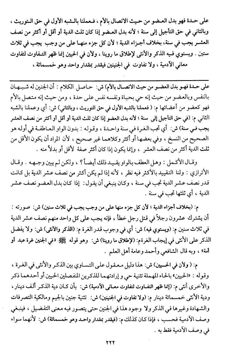 على حدة فهو بدل العضو من حيث الاتصال بالأم، فعملنا بالشبه الأول في حق التوريث، وبالثاني في حق التأجيل إلى سنة؛ لأنه بدل العضو إذا كان ثلث الدية أو أقل أو أكثر من نصف العشر يجب في سنة، بخلاف أجزاء الدية؛ لأن كل جزء منها على من وجب يجب في ثلاث سنين. ويستوي فيه الذكر والأنثى لإطلاق ما روينا، ولأن في الحيين إنما ظهر التفاوت لتفاوت معاني الآدمية، ولا تفاوت في الجنينين فيقدر بمقدار واحد وهو خمسمائة