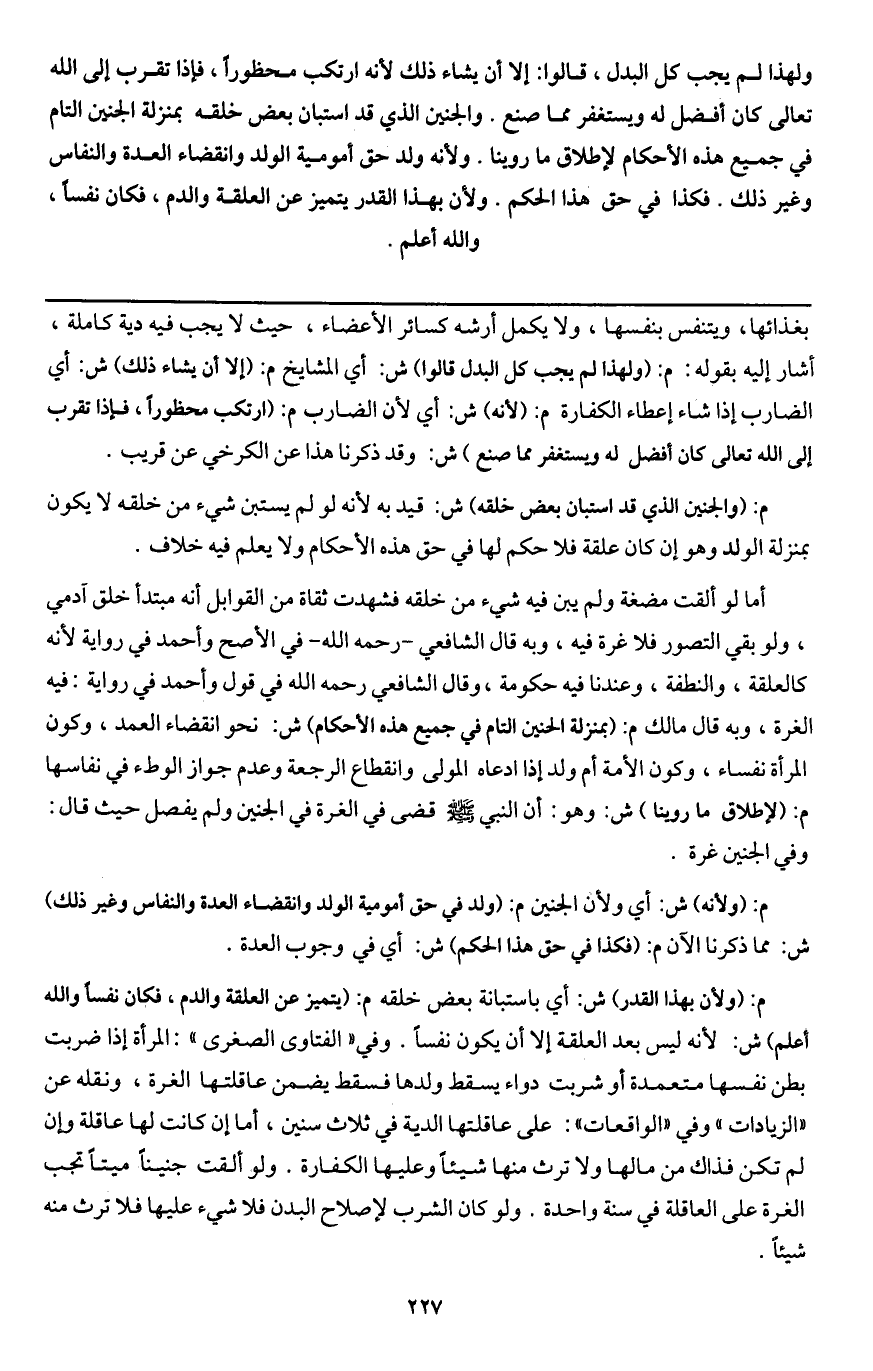 ولهذا لم يجب كل البدل، قالوا: إلا أن يشاء ذلك لأنه ارتكب محظورا، فإذا تقرب إلى الله تعالى كان أفضل له ويستغفر مما صنع. والجنين الذي قد استبان بعض خلقه بمنزلة الجنين التام في جميع هذه الأحكام لإطلاق ما روينا. ولأنه ولد حق أمومية الولد وانقضاء العدة والنفاس وغير ذلك. فكذا في حق هذا الحكم. ولأن بهذا القدر يتميز عن العلقة والدم، فكان نفسا، والله أعلم.