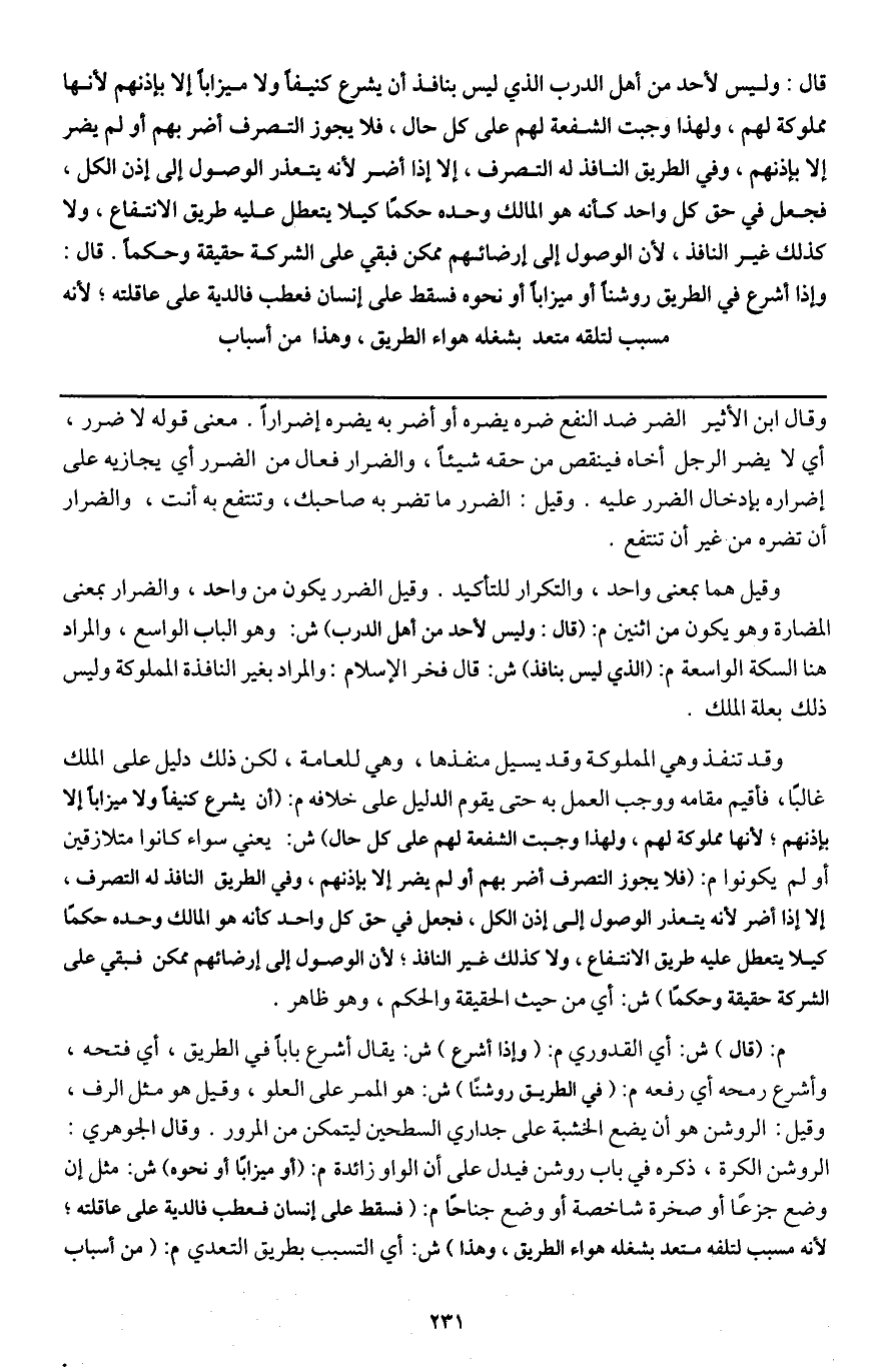 قال: وليس لأحد من أهل الدرب الذي ليس بنافذ أن يشرع كنيفا ولا ميزابا إلا بإذنهم لأنها مملوكة لهم، ولهذا وجبت الشفعة لهم على كل حال، فلا يجوز التصرف أضر بهم أو لم يضر إلا بإذنهم، وفي الطريق النافذ له التصرف، إلا إذا أضر لأنه يتعذر الوصول إلى إذن الكل، فجعل في حق كل واحد كأنه هو المالك وحده حكما كيلا يتعطل عليه طريق الانتفاع، ولا كذلك غير النافذ، لأن الوصول إلى إرضائهم ممكن فبقي على الشركة حقيقة وحكما.