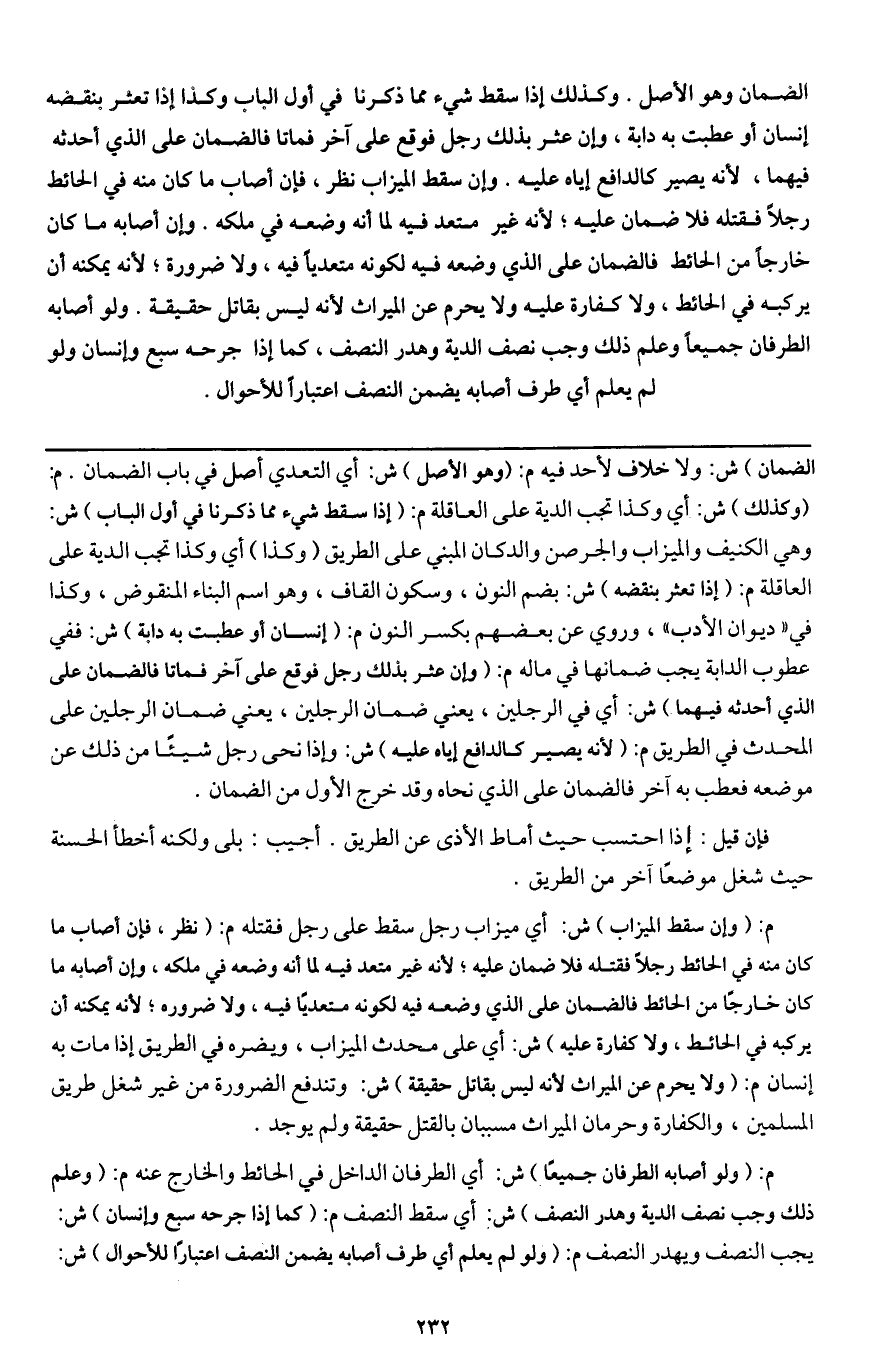 الضمان وهو الأصل. وكذلك إذا سقط شيء مما ذكرنا في أول الباب وكذا إذا تعثر بنقضه إنسان أو عطبت به دابة، وإن عثر بذلك رجل فوقع على آخر فماتا فالضمان على الذي أحدثه فيهما؛ لأنه يصير كالدافع إياه عليه.
