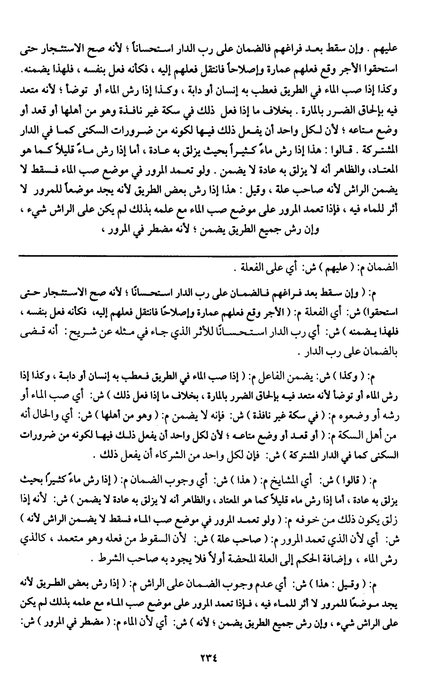 عليهم. وإن سقط بعد فراغهم فالضمان على رب الدار استحسانا؛ لأنه صح الاستئجار حتى استحقوا الأجر وقع فعلهم عمارة وإصلاحا فانتقل فعلهم إليه، فكأنه فعل بنفسه، فلهذا يضمنه. وكذا إذا صب الماء في الطريق فعطب به إنسان أو دابة، وكذا إذا رش الماء أو توضأ؛ لأنه متعد فيه بإلحاق الضرر بالمارة. بخلاف ما إذا فعل ذلك في سكة غير نافذة وهو من أهلها أو قعد أو وضع متاعه؛ لأن لكل واحد أن يفعل ذلك فيها لكونه من ضرورات السكنى كما في الدار المشتركة. قالوا: هذا إذا رش ماء كثيرا بحيث يزلق به عادة، أما إذا رش ماء قليلا كما هو المعتاد، والظاهر أنه لا يزلق به عادة لا يضمن. ولو تعمد المرور في موضع صب الماء فسقط لا يضمن الراش لأنه صاحب علة، وقيل: هذا إذا رش بعض الطريق لأنه يجد موضعا للمرور لا أثر للماء فيه، فإذا تعمد المرور على موضع صب الماء مع علمه بذلك لم يكن على الراش شيء، وإن رش جميع الطريق يضمن؛ لأنه مضطر في المرور،.