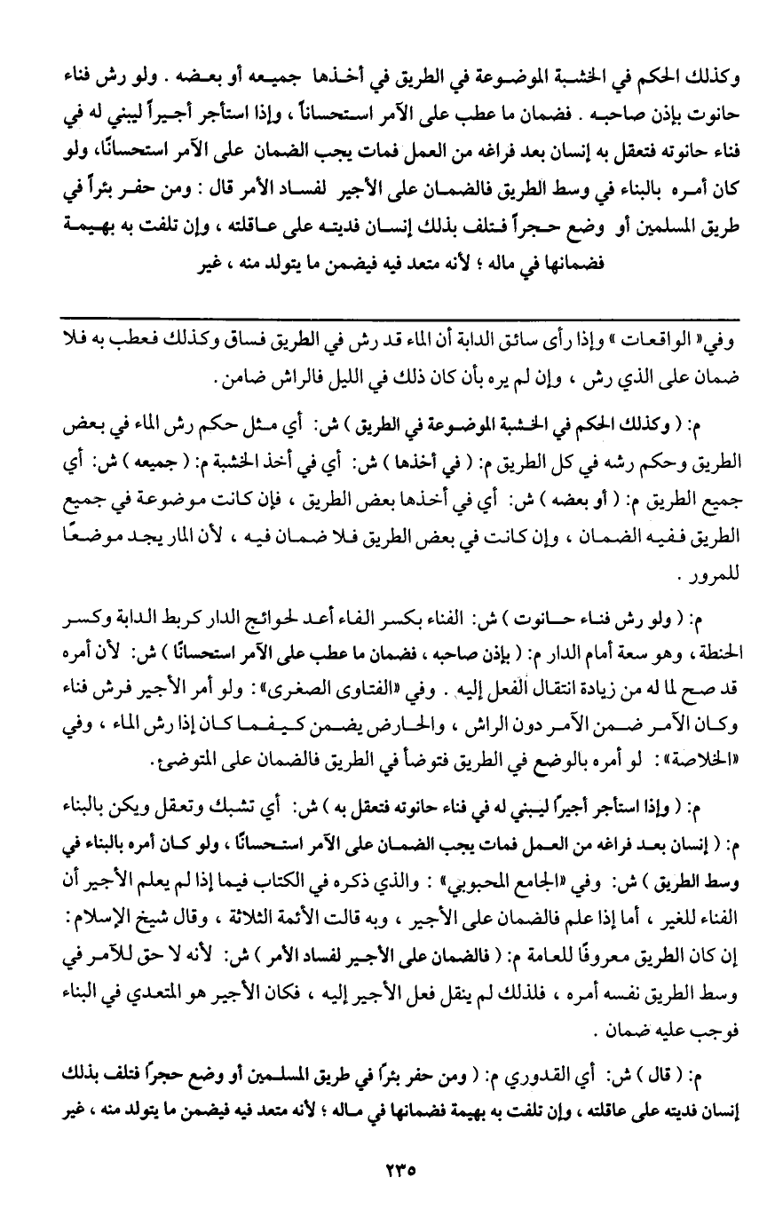 ـــــــــــــــــــــــــــــQوفي " الواقعات " وإذا رأى سائق الدابة أن الماء قد رش في الطريق فساق وكذلك فعطب به فلا ضمان على الذي رش، وإن لم يره بأن كان ذلك في الليل فالراش ضامن.