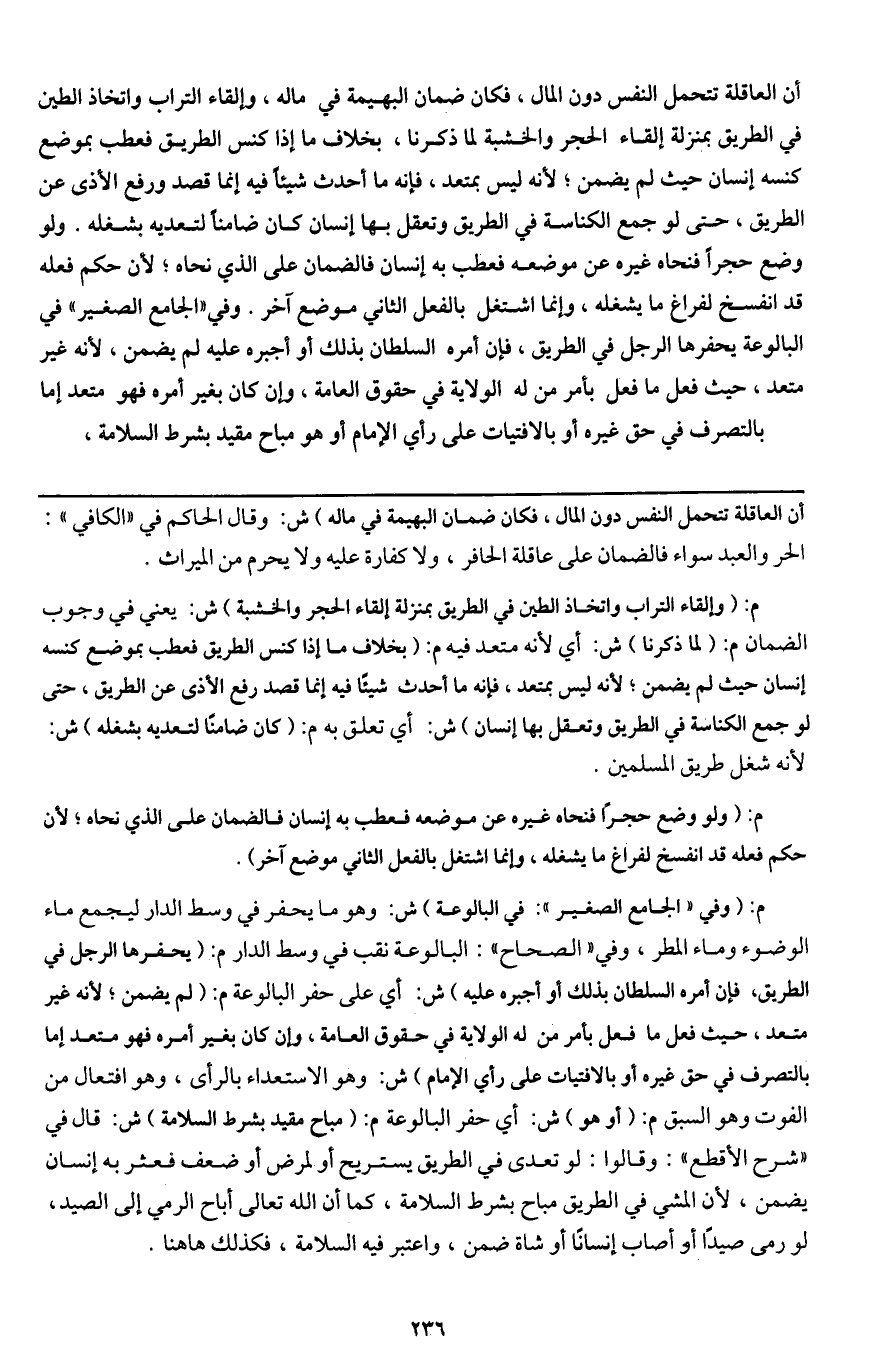 أن العاقلة تتحمل النفس دون المال، فكان ضمان البهيمة في ماله، وإلقاء التراب واتخاذ الطين في الطريق بمنزلة إلقاء الحجر والخشبة لما ذكرنا، بخلاف ما إذا كنس الطريق فعطب بموضع كنسه إنسان حيث لم يضمن؛ لأنه ليس بمتعد، فإنه ما أحدث شيئا فيه إنما قصد ورفع الأذى عن الطريق، حتى لو جمع الكناسة في الطريق وتعقل بها إنسان كان ضامنا لتعديه بشغله.