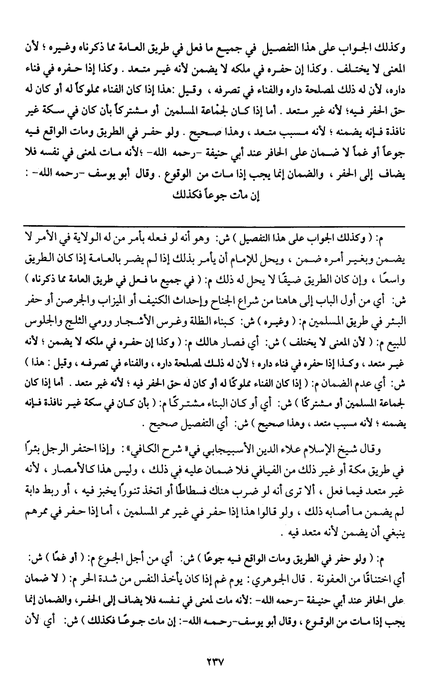 وقال شيخ الإسلام علاء الدين الأسبيجابي في " شرح الكافي ": وإذا احتفر الرجل بئرا في طريق مكة أو غير ذلك من الفيافي فلا ضمان عليه في ذلك، وليس هذا كالأمصار، لأنه غير متعد فيما فعل، ألا ترى أنه لو ضرب هناك فسطاطا أو اتخذ تنورا يخبز فيه، أو ربط دابة لم يضمن ما أصابه ذلك، ولو قالوا هذا إذا حفر في غير ممر المسلمين، أما إذا حفر في ممرهم ينبغي أن يضمن لأنه متعد فيه.