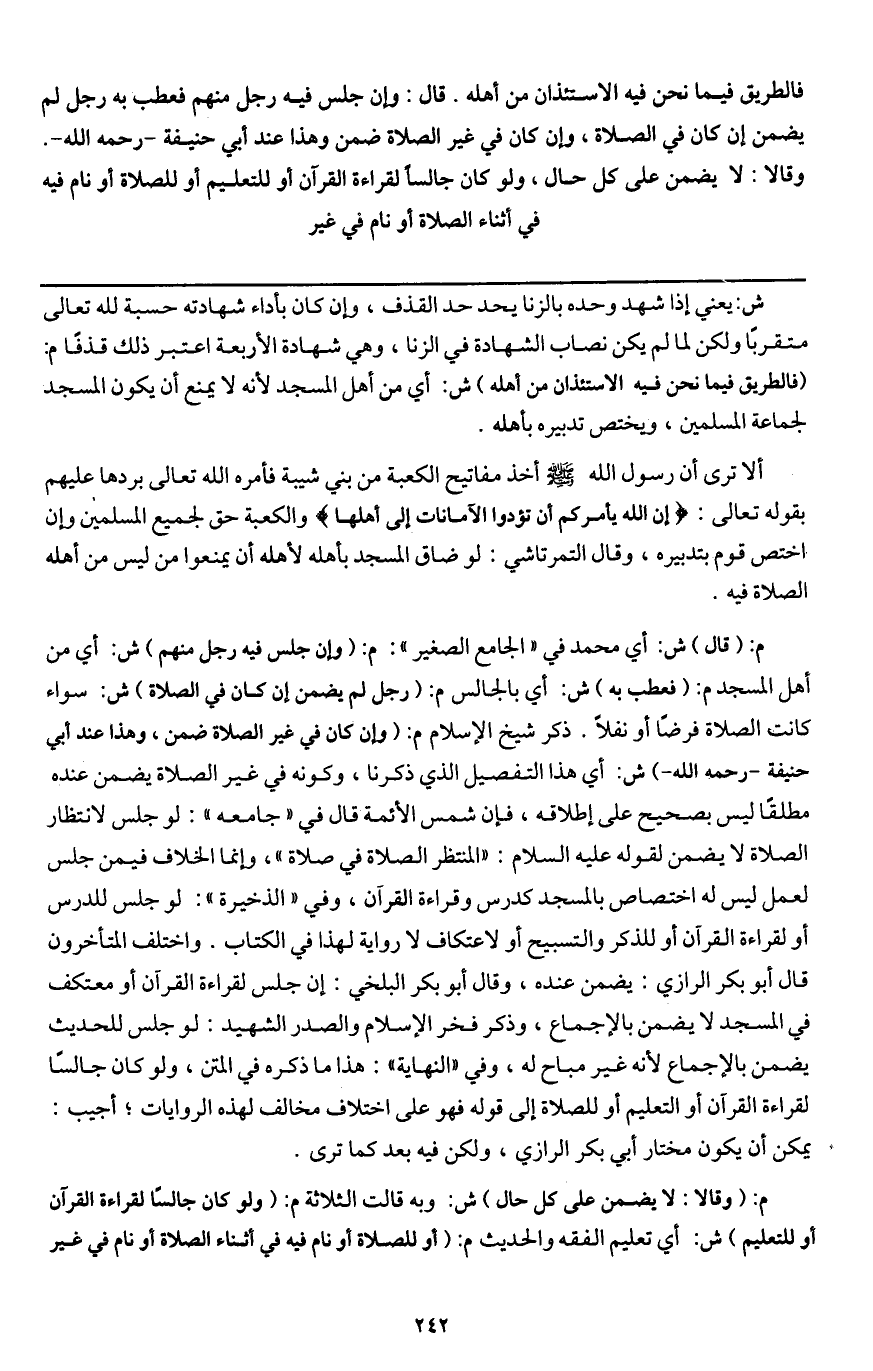 فالطريق فيما نحن فيه الاستئذان من أهله. قال: وإن جلس فيه رجل منهم فعطب به رجل لم يضمن إن كان في الصلاة، وإن كان في غير الصلاة ضمن، وهذا عند أبي حنيفة - رَحِمَهُ اللَّهُ -. وقالا: لا يضمن على كل حال، ولو كان جالسا لقراءة القرآن أو للتعليم أو للصلاة أو نام فيه في أثناء الصلاة أو نام في غير.