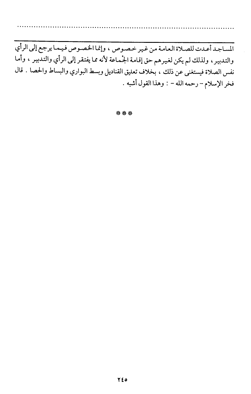 ـــــــــــــــــــــــــــــQالمساجد أعدت للصلاة العامة من غير خصوص، وإنما الخصوص فيما يرجع إلى الرأي والتدبير، ولذلك لم يكن لغيرهم حق إقامة الجماعة لأنه مما يفتقر إلى الرأي والتدبير، وأما نفس الصلاة فيستغنى عن ذلك، بخلاف تعليق القناديل وبسط البواري والبساط والحصا. قال فخر الإسلام - رَحِمَهُ اللَّهُ -: وهذا القول أشبه.