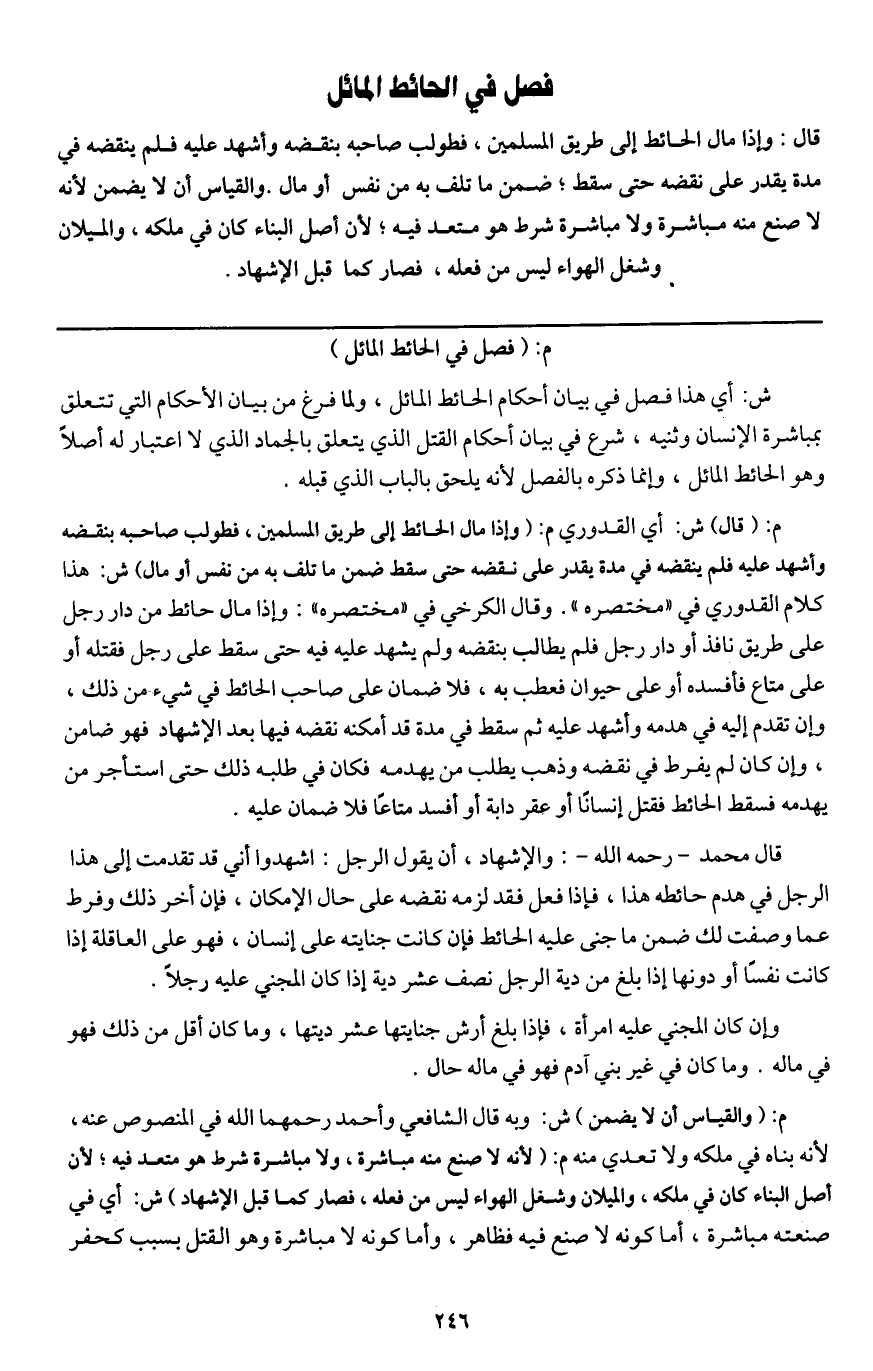 قال محمد - رَحِمَهُ اللَّهُ -: والإشهاد، أن يقول الرجل: اشهدوا أني قد تقدمت إلى هذا الرجل في هدم حائطه هذا، فإذا فعل فقد لزمه نقضه على حال الإمكان، فإن أخر ذلك وفرط عما وصفت لك ضمن ما جنى عليه الحائط فإن كانت جنايته على إنسان، فهو على العاقلة إذا كانت نفسا أو دونها إذا بلغ من دية الرجل نصف عشر دية إذا كان المجني عليه رجلا.