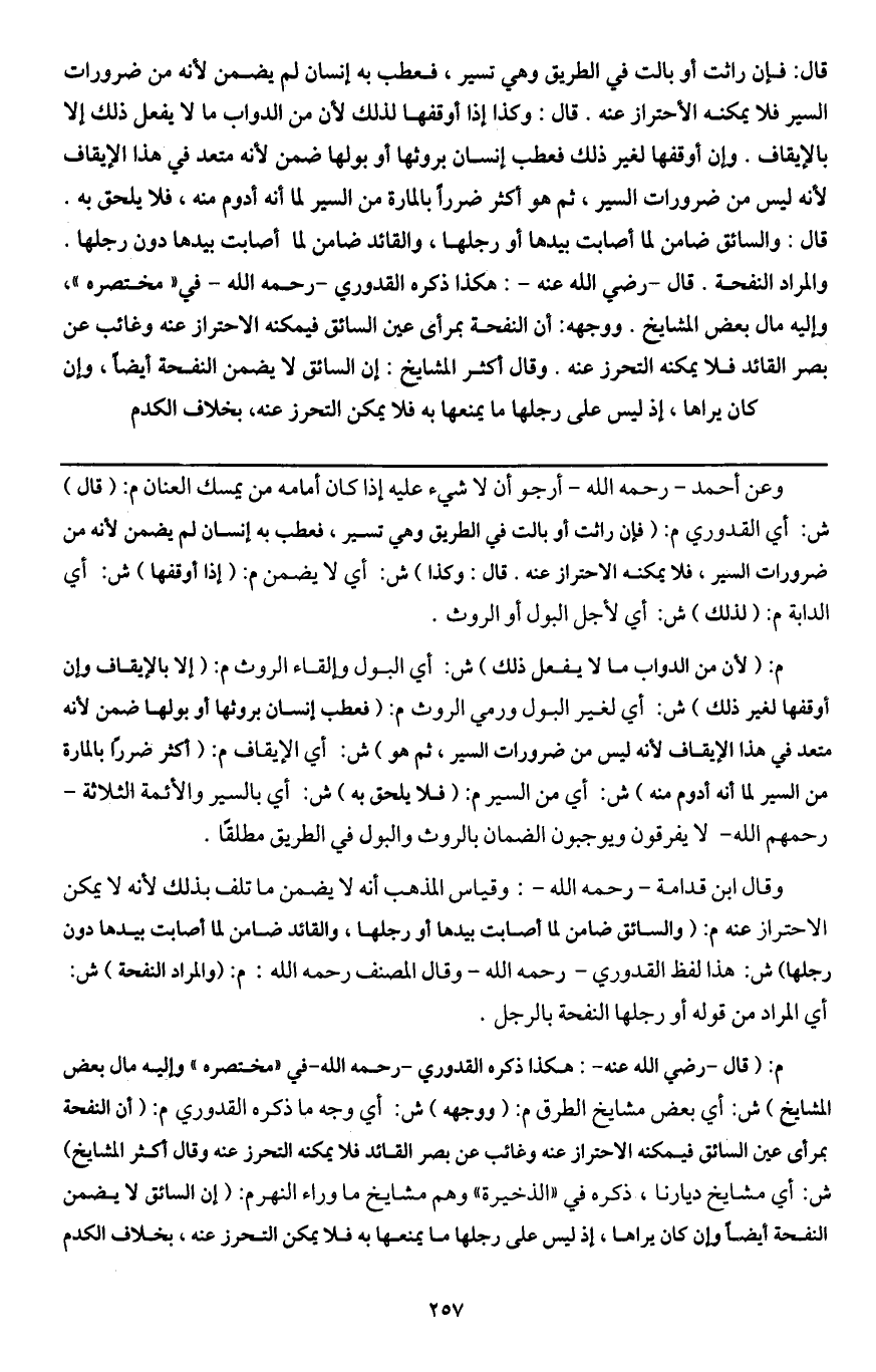 وقال ابن قدامة - رَحِمَهُ اللَّهُ -: وقياس المذهب أنه لا يضمن ما تلف بذلك لأنه لا يمكن الاحتراز عنه م: (والسائق ضامن لما أصابت بيدها أو رجلها، والقائد ضامن لما أصابت بيدها دون رجلها) ش: هذا لفظ القدوري - رَحِمَهُ اللَّهُ - وقال المصنف - رَحِمَهُ اللَّهُ -: م: (والمراد النفحة) ش: أي المراد من قوله أو رجلها النفحة بالرجل.