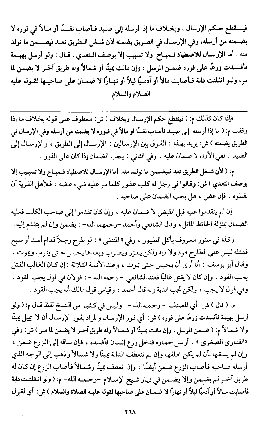 فينقطع حكم الإرسال، وبخلاف ما إذا أرسله إلى صيد فأصاب نفسا أو مالا في فوره لا يضمنه من أرسله، وفي الإرسال في الطريق يضمنه لأن شغل الطريق تعد فيضمن ما تولد منه. أما الإرسال للاصطياد فمباح ولا تسبيب إلا بوصف التعدي.