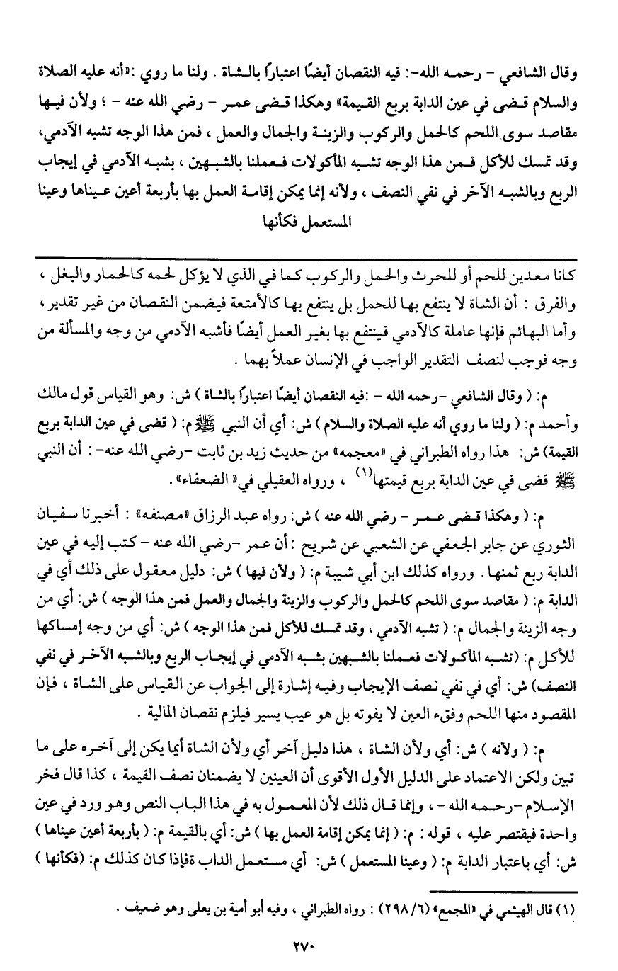 ـــــــــــــــــــــــــــــQكانا معدين للحم أو للحرث والحمل والركوب كما في الذي لا يؤكل لحمه كالحمار والبغل، والفرق: أن الشاة لا ينتفع بها للحمل بل ينتفع بها كالأمتعة فيضمن النقصان من غير تقدير وأما البهائم فإنها عاملة كالآدمي فينتفع بها بغير العمل أيضا فأشبه الآدمي من وجه والمسألة من وجه فوجب لنصف التقدير الواجب في الإنسان عملا بهما.