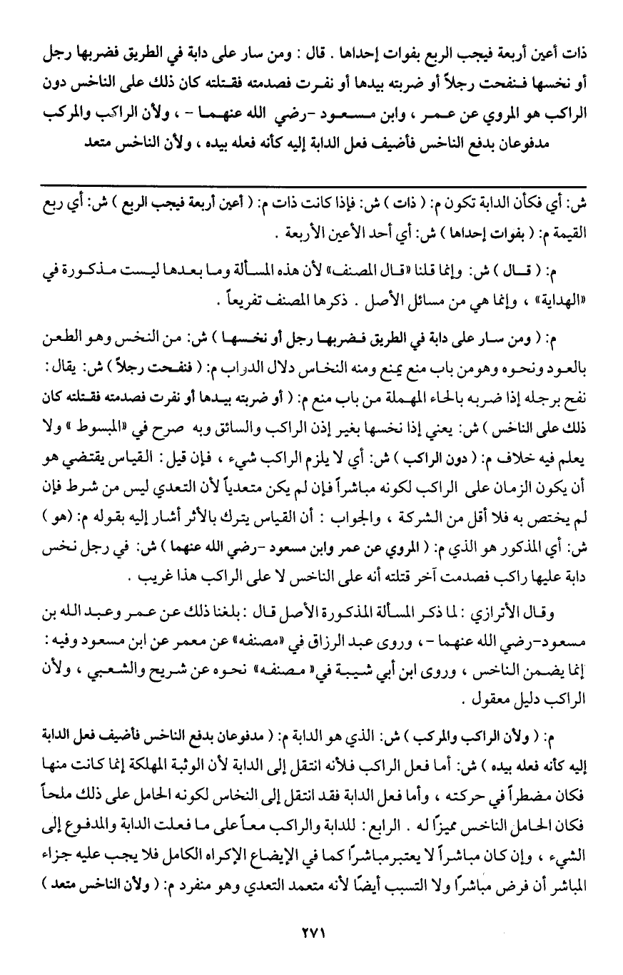 قال: ومن سار على دابة في الطريق فضربها رجل أو نخسها فنفحت رجلا أو ضربته بيدها أو نفرت فصدمته فقتلته كان ذلك على الناخس دون الراكب هو المروي عن عمر، وابن مسعود - رَضِيَ اللَّهُ عَنْهُمَا - " ولأن الراكب والمركب مدفوعان بدفع الناخس فأضيف فعل الدابة إليه كأنه فعله بيده، ولأن الناخس متعد.