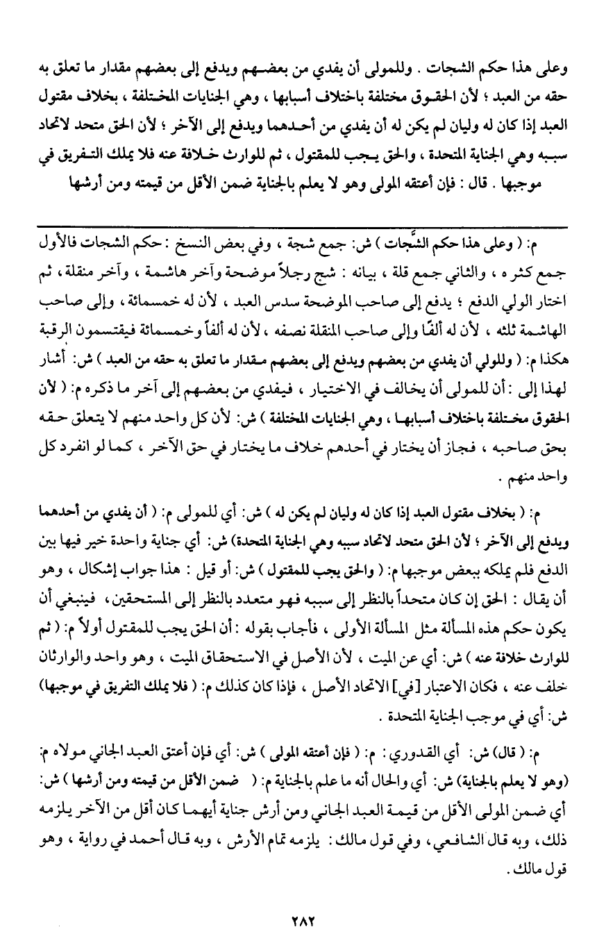 وعلى هذا حكم الشجات. وللمولى أن يفدي من بعضهم ويدفع إلى بعضهم مقدار ما تعلق به حقه من العبد؛ لأن الحقوق مختلفة باختلاف أسبابها، وهي الجنايات المختلفة، بخلاف مقتول العبد إذا كان له وليان لم يكن له أن يفدي من أحدهما ويدفع إلى الآخر؛ لأن الحق متحد لاتحاد سببه وهي الجناية المتحدة، والحق يجب للمقتول، ثم للوارث خلافة عنه فلا يملك التفريق في موجبها.