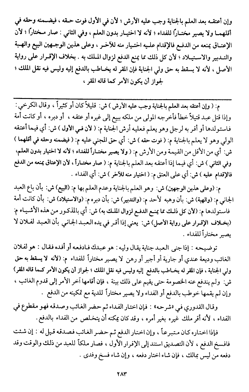 وإن أعتقه بعد العلم بالجناية وجب عليه الأرش؛ لأن في الأول فوت حقه، فيضمنه وحقه في أقلهما ولا يصير مختارا للفداء؛ لأنه لا اختيار بدون العلم " وفي الثاني: صار مختارا؛ لأن الإعتاق يمنعه من الدفع فالإقدام عليه اختيار منه للآخر " وعلى هذين الوجهين البيع والهبة والتدبير والاستيلاد؛ لأن كل ذلك مما يمنع الدفع لزوال الملك به. بخلاف الإقرار على رواية الأصل، لأنه لا يسقط به حق ولي الجناية فإن المقر له يخاطب بالدفع إليه وليس فيه نقل الملك لجواز أن يكون الأمر كما قاله المقر،