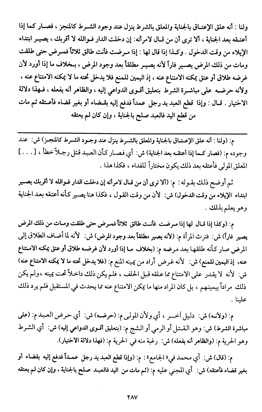 ولنا: أنه علق الإعتاق بالجناية والمعلق بالشرط ينزل عند وجود الشرط كالمنجز، فصار كما إذا أعتقه بعد الجناية، ألا ترى أن من قال لامرأته: إن دخلت الدار فوالله لا أقربك، يصير ابتداء الإيلاء من وقت الدخول. وكذا إذا قال لها: إذا مرضت فأنت طالق ثلاثا فمرض حتى طلقت ومات من ذلك المرض يصير فارا لأنه يصير مطلقا بعد وجود المرض، بخلاف ما إذا أورد لأن غرضه طلاق أو عتق يمكنه الامتناع عنه، إذ اليمين للمنع فلا يدخل تحته ما لا يمكنه الامتناع عنه، ولأنه حرضه على مباشرة الشرط بتعليق أقوى الدواعي إليه، والظاهر أنه يفعله، فهذا دلالة الاختيار.