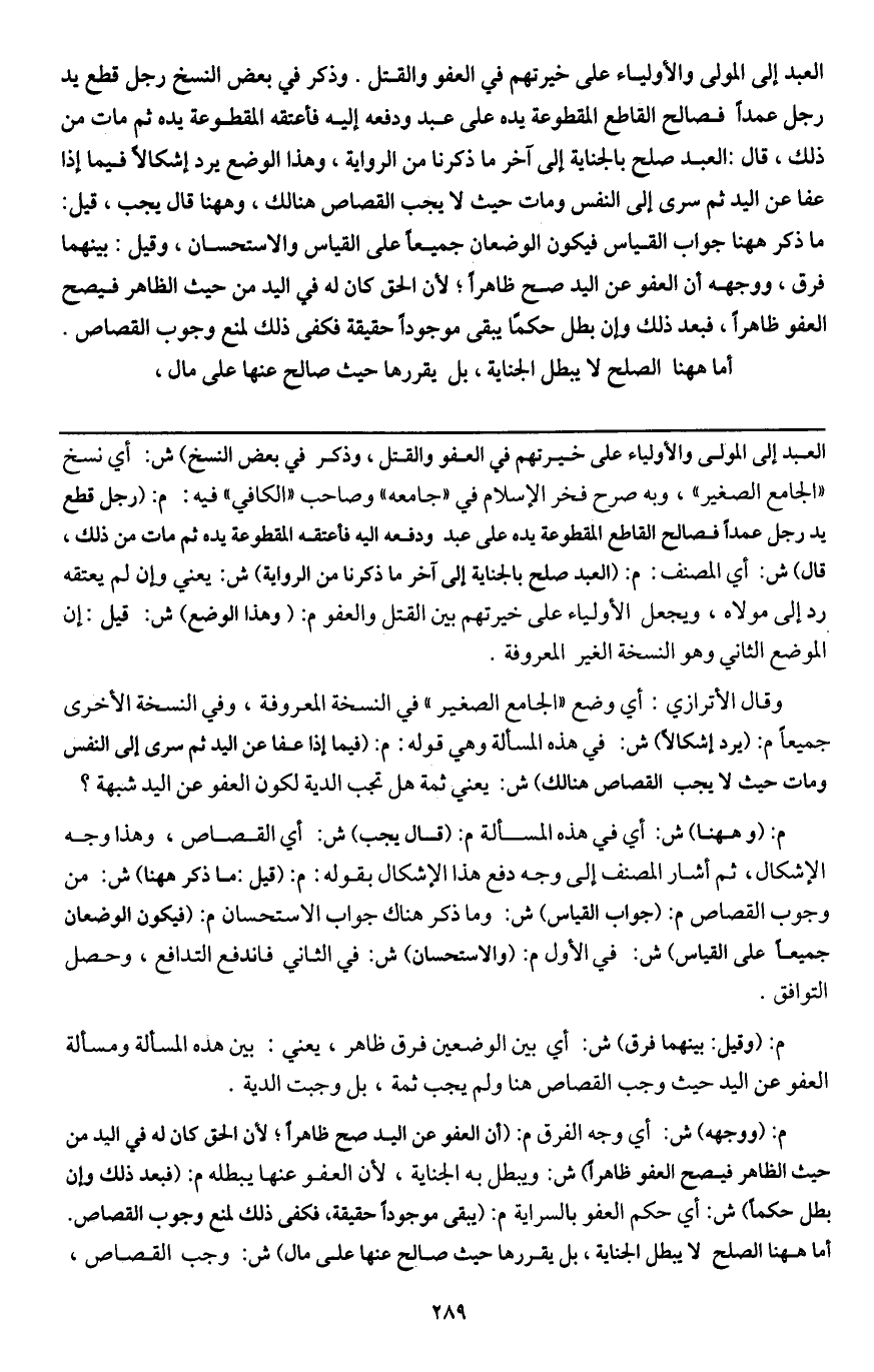 ـــــــــــــــــــــــــــــQالعبد إلى المولى والأولياء على خيرتهم في العفو والقتل وذكر في بعض النسخ) ش: أي: نسخ " الجامع الصغير "، وبه صرح فخر الإسلام في " جامعه " وصاحب " الكافي " فيه: م: (رجل قطع يد رجل عمدا فصالح القاطع المقطوعة يده على عبد ودفعه إليه فأعتقه المقطوعة يده ثم مات من ذلك، قال) ش: أي المصنف: م: (العبد صلح بالجناية إلى آخر ما ذكرنا من الرواية) ش: يعني وإن لم يعتقه رد إلى مولاه، ويجعل الأولياء على خيرتهم بين القتل والعفو م: (وهذا الوضع) ش: قيل: إن الموضع الثاني وهو النسخة الغير المعروفة. وقال الأترازي: أي وضع " الجامع الصغير " في النسخة المعروفة، وفي النسخة الأخرى جميعا م: (يرد إشكالا) ش: في هذه المسألة وهي قوله: م: (فيما إذا عفا عن اليد ثم سرى إلى النفس ومات حيث لا يجب القصاص هنالك) ش: يعني ثمة هل تجب الدية لكون العفو عن اليد شبهة؟