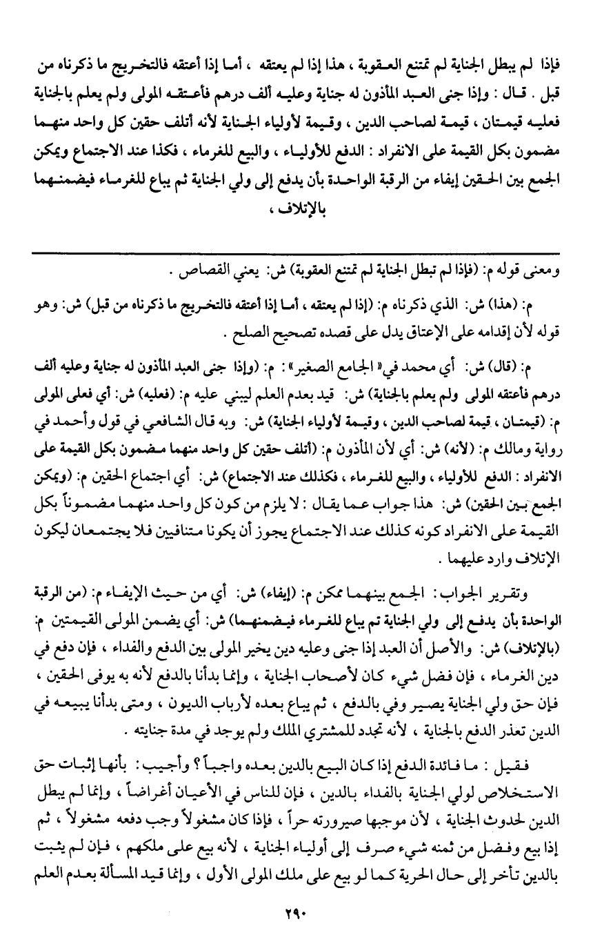 فقيل: ما فائدة الدفع إذا كان البيع بالدين بعده واجبا) وأجيب: بأنها إثبات حق الاستخلاص لولي الجناية بالفداء بالدين، فإن للناس في الأعيان أغراضا، وإنما لم يبطل الدين لحدوث الجناية، لأن موجبها صيرورته حرا، فإذا كان مشغولا وجب دفعه مشغولا، ثم إذا بيع وفضل من ثمنه شيء صرف إلى أولياء الجناية، لأنه بيع على ملكهم، فإن لم يثبت بالدين تأخر إلى حال الحرية كما لو بيع على ملك المولى الأول، وإنما قيد المسألة بعدم العلم