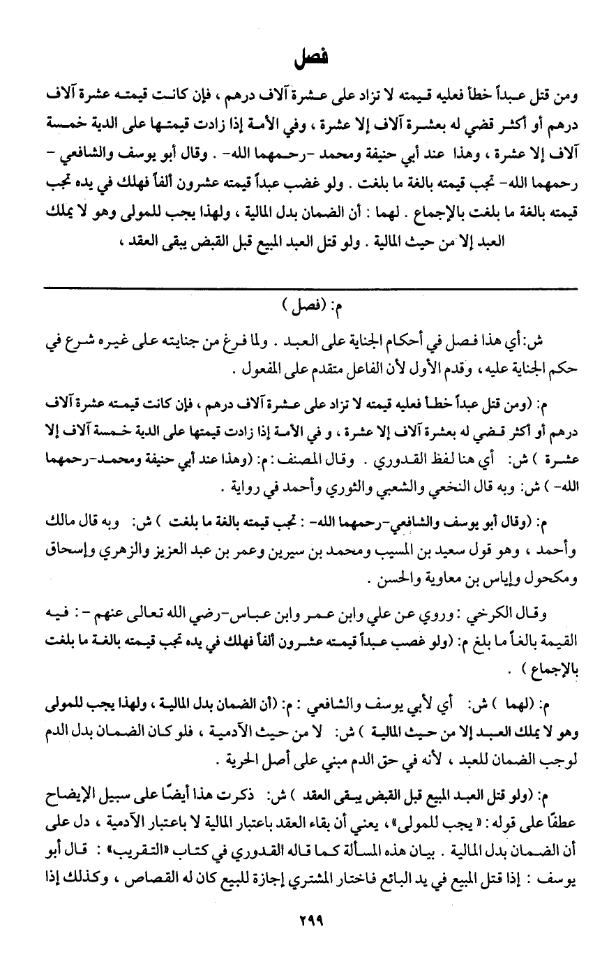 فصل ومن قتل عبدا خطأ فعليه قيمته لا تزاد على عشرة آلاف درهم، فإن كانت قيمته عشرة آلاف درهم أو أكثر قضي له بعشرة آلاف إلا عشرة وفي الأمة إذا زادت قيمتها على الدية خمسة آلاف إلا عشرة، وهذا عند أبي حنيفة ومحمد - رحمهما الله -. وقال أبو يوسف والشافعي - رحمهما الله - تجب قيمته بالغة ما بلغت. ولو غصب عبدا قيمته عشرون ألفا فهلك في يده تجب قيمته بالغة ما بلغت بالإجماع. لهما: أن الضمان بدل المالية، ولهذا يجب للمولى وهو لا يملك العبد إلا من حيث المالية. ولو قتل العبد المبيع قبل القبض يبقى العقد،