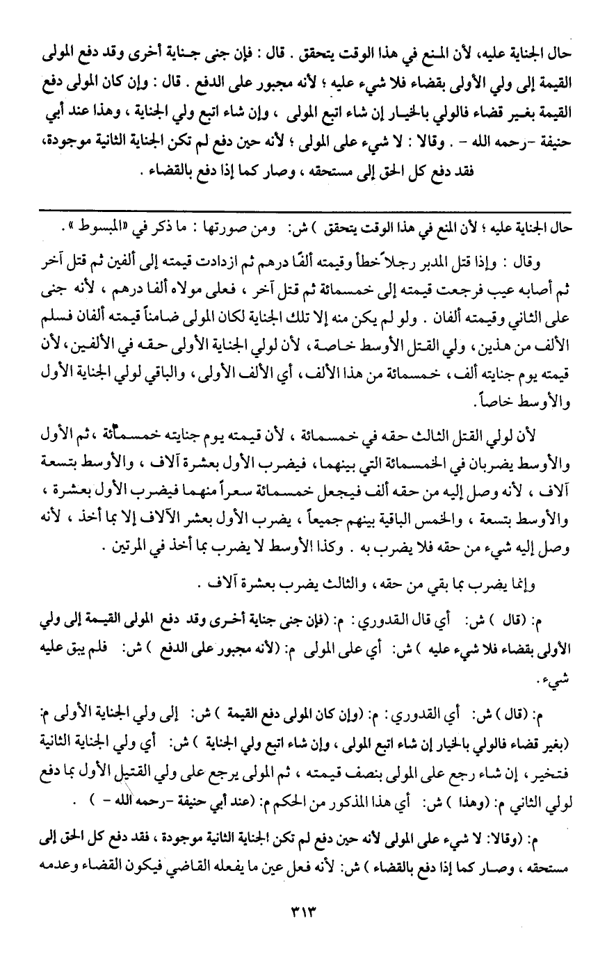 وقال: وإذا قتل المدبر رجلا خطأ وقيمته ألف درهم ثم ازدادت قيمته إلى ألفين ثم قتل آخر ثم أصابه عيب فرجعت قيمته إلى خمسمائة ثم قتل آخر، فعلى مولاه ألفا درهم، لأنه جنى على الثاني وقيمته ألفان. ولو لم يكن منه إلا تلك الجناية لكان المولى ضامنا قيمته ألفان فسلم الألف من هذين، ولي القتل الأوسط خاصة، لأن لولي الجناية الأولى حقه في الألفين، لأن قيمته يوم جنايته ألف، خمسمائة من هذا الألف، أي الألف الأولى، والباقي لولي الجناية الأول والأوسط خاصا.
