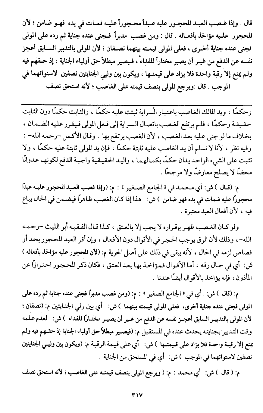 ـــــــــــــــــــــــــــــQوحكما، ويد المالك الغاصب باعتبار السراية ثبتت عليه حكما، والثابت حكما دون الثابت حقيقة وحكما، فلم يرتفع الغصب باتصال السراية إلى فعل المولى فيقرر عليه الضمان، بخلاف ما لو جنى عليه بعد الغصب، لأن الغصب يرتفع بها. وقال الأكمل - رَحِمَهُ اللَّهُ -: وفيه نظر، لأنا لا نسلم أن يد الغاصب عليه ثابتة حكما، فإن يد المولى ثابتة عليه حكما، ولا تثبت على الشيء الواحد يدان حكما بكمالهما، واليد الحقيقية واجبة الدفع لكونها عدوانا محضا لا يصلح معارضا ولا مرجحا.