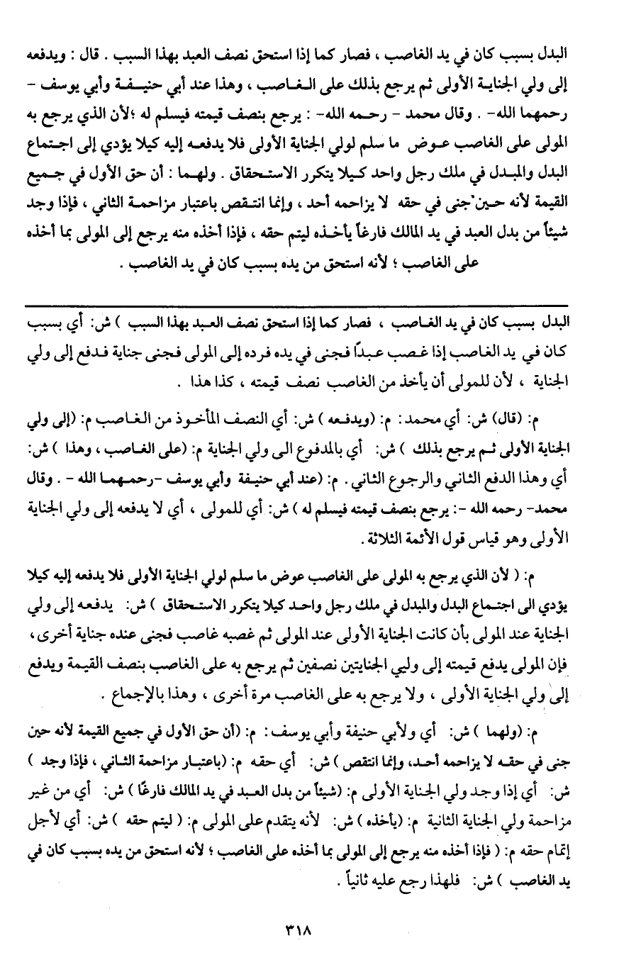 م: (لأن الذي يرجع به المولى على الغاصب عوض ما سلم لولي الجناية الأولى فلا يدفعه إليه كي لا يؤدي إلى اجتماع البدل والمبدل في ملك رجل واحد كي لا يتكرر الاستحقاق) ش: يدفعه إلى ولي الجناية عند المولى بأن كانت الجناية الأولى عند المولى ثم غصبه غاصب فجنى عنده جناية أخرى، فإن المولى يدفع قيمته إلى وليي الجنايتين نصفين ثم يرجع به على الغاصب بنصف القيمة ويدفع إلى ولي الجناية الأولى، ولا يرجع به على الغاصب مرة أخرى، وهذا بالإجماع.