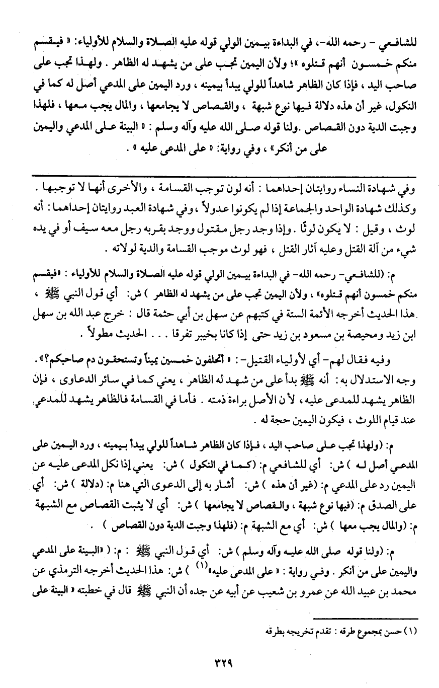 م: (ولهذا تجب على صاحب اليد، فإذا كان الظاهر شاهدا للولي يبدأ بيمينه، ورد اليمين على المدعي أصل له) ش: أي للشافعي م: (كما في النكول) ش: يعني إذا نكل المدعى عليه عن اليمين رد على المدعي م: (غير أن هذه) ش: أشار به إلى الدعوى التي هنا م: (دلالة) ش: أي على الصدق م: (فيها نوع شبهة، والقصاص لا يجامعها) ش: أي لا يثبت القصاص مع الشبهة م: (والمال يجب معها) ش: أي مع الشبهة م: (فلهذا وجبت الدية دون القصاص) . م: (ولنا قوله - صَلَّى اللَّهُ عَلَيْهِ وَآلِهِ وَسَلَّمَ -) ش: أي قول النبي - صَلَّى اللَّهُ عَلَيْهِ وَسَلَّمَ -: م: «البينة على المدعي واليمين على من أنكر. وفي رواية: " على المدعى عليه» ش: هذا الحديث أخرجه الترمذي عن محمد بن عبيد الله عن عمرو بن شعيب عن أبيه عن جده أن النبي - صَلَّى اللَّهُ عَلَيْهِ وَسَلَّمَ - قال في خطبته «البينة علي