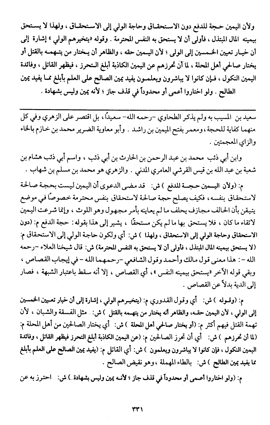 ولأن اليمين حجة للدفع دون الاستحقاق وحاجة الولي إلى الاستحقاق، ولهذا لا يستحق بيمينه المال المبتذل، فأولى أن لا يستحق به النفس المحترمة. وقوله " يتخيرهم الولي " إشارة إلى أن خيار تعيين الخمسين إلى الولي؛ لأن اليمين حقه، والظاهر أن يختار من يتهمه بالقتل أو يختار صالحي أهل المحلة، لما أن تحرزهم عن اليمين الكاذبة أبلغ التحرز، فيظهر القاتل، وفائدة اليمين النكول، فإن كانوا لا يباشرون ويعلمون يفيد يمين الصالح على العلم بأبلغ مما يفيد يمين الطالح. ولو اختاروا أعمى أو محدودا في قذف جاز؛ لأنه يمين وليس بشهادة.