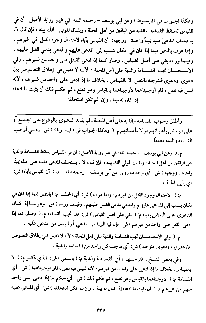 وهكذا الجواب في " المبسوط " وعن أبي يوسف - رَحِمَهُ اللَّهُ - في غير رواية الأصل: أن في القياس تسقط القسامة والدية عن الباقين من أهل المحلة، ويقال للولي: ألك بينة، فإن قال لا، يستحلف المدعى عليه يمينا واحدة. ووجهه: أن القياس يأباه لاحتمال وجود القتل في غيرهم، وإنما عرف بالنص فيما إذا كان في مكان ينسب إلى المدعى عليهم والمدعي يدعي القتل عليهم، وفيما وراءه بقي على أصل القياس، وصار كما إذا ادعى القتل على واحد من غيرهم. وفي الاستحسان تجب القسامة والدية على أهل المحلة؛ لأنه لا فصل في إطلاق النصوص بين دعوى ودعوى فنوجبه بالنص لا بالقياس. بخلاف ما إذا ادعى على واحد من غيرهم؛ لأنه ليس فيه نص، فلو أوجبناهما لأوجبناهما بالقياس وهو ممتنع، ثم حكم ذلك أن يثبت ما ادعاه إذا كان له بينة، وإن لم تكن استحلفه
