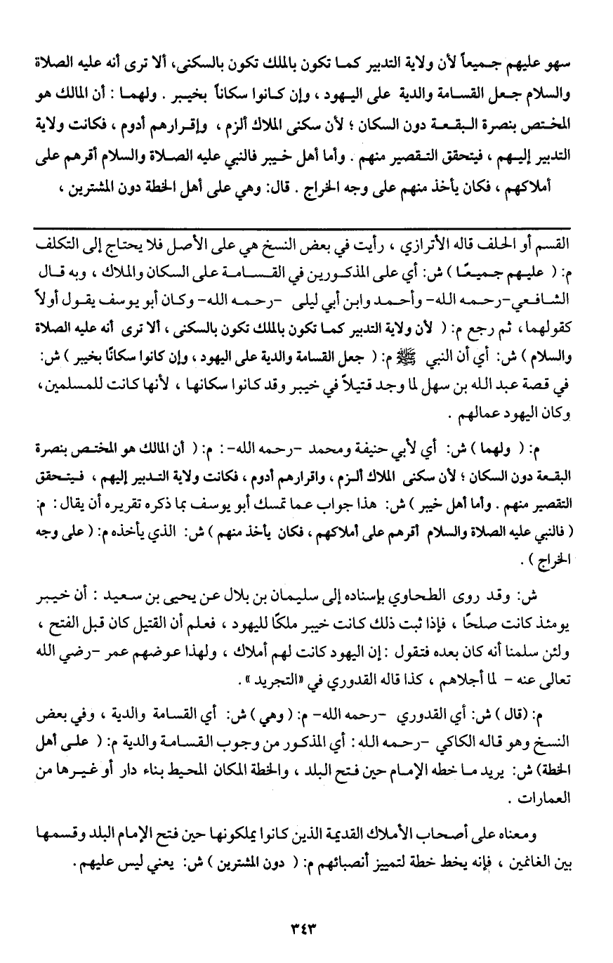 سهو عليهم جميعا لأن ولاية التدبير كما تكون بالملك تكون بالسكنى، ألا ترى أنه - عَلَيْهِ الصَّلَاةُ وَالسَّلَامُ - جعل القسامة والدية على اليهود، وإن كانوا سكانا بخيبر. ولهما: أن المالك هو المختص بنصرة البقعة دون السكان؛ لأن سكنى الملاك ألزم، وإقرارهم أدوم، فكانت ولاية التدبير إليهم، فيتحقق التقصير منهم. وأما أهل خيبر فالنبي - عَلَيْهِ الصَّلَاةُ وَالسَّلَامُ - أقرهم على أملاكهم، فكان يأخذ منهم على وجه الخراج.