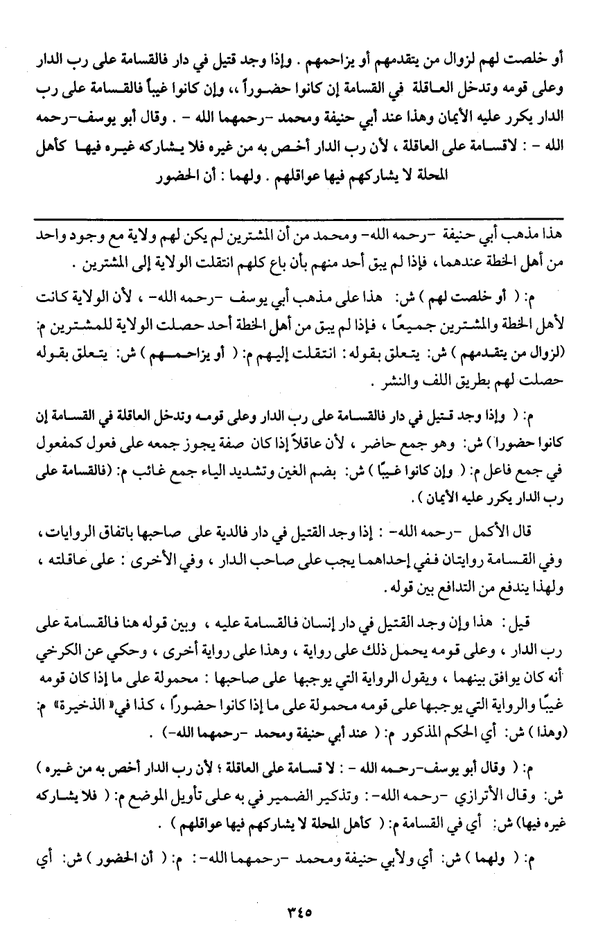م: (وقال أبو يوسف - رَحِمَهُ اللَّهُ -: لا قسامة على العاقلة، لأن رب الدار أخص به من غيره) ش: وقال الأترازي - رَحِمَهُ اللَّهُ -: وتذكير الضمير في به على تأويل الموضع م: (فلا يشاركه غيره فيها) ش: أي في القسامة م: (كأهل المحلة لا يشاركهم فيها عواقلهم) .