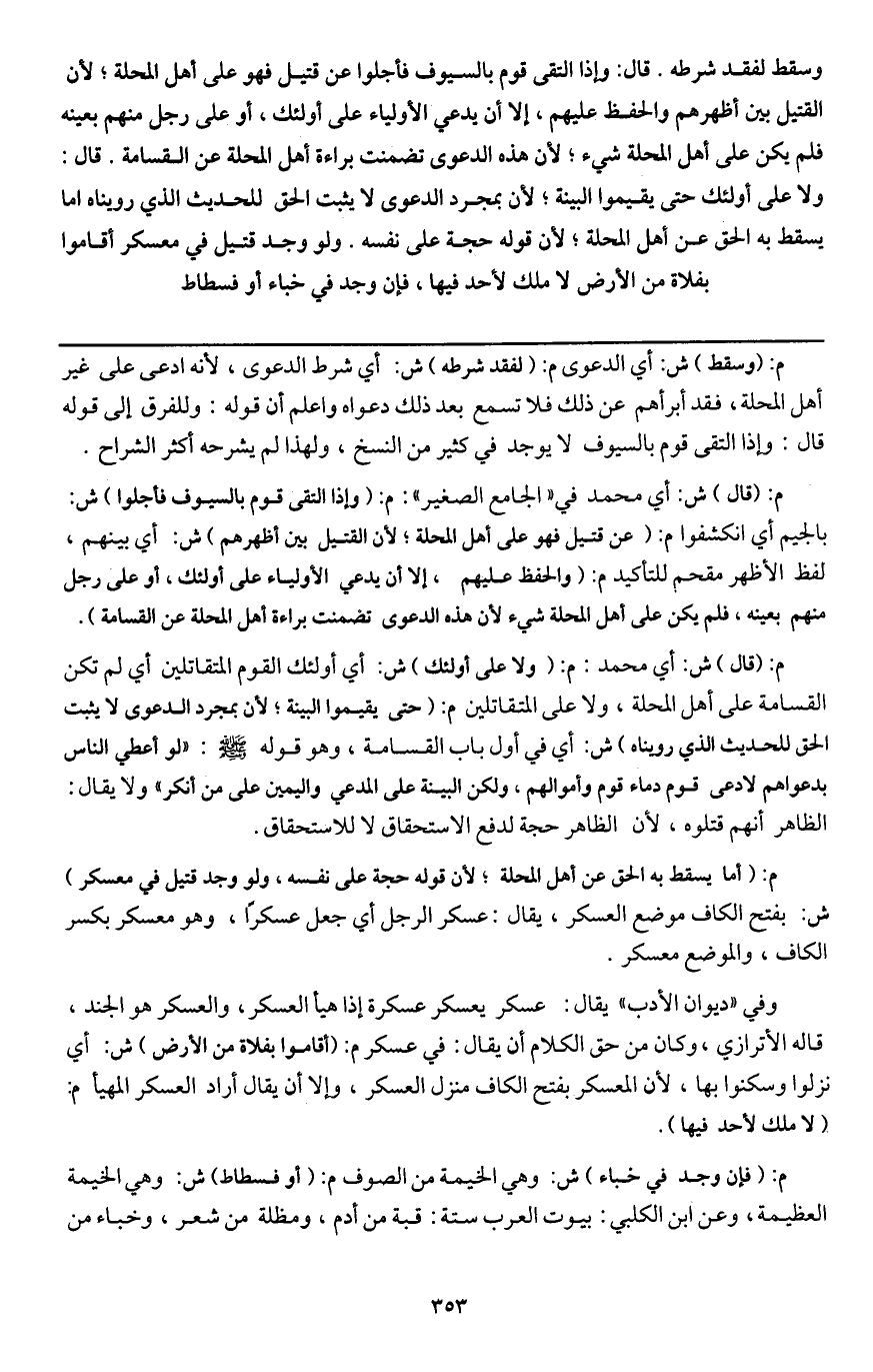 م: (أما يسقط به الحق عن أهل المحلة؛ لأن قوله حجة على نفسه، ولو وجد قتيل في معسكر) ش: بفتح الكاف موضع العسكر، يقال: عسكر الرجل أي جعل عسكرا، وهو معسكر بكسر الكاف، والموضع معسكر.