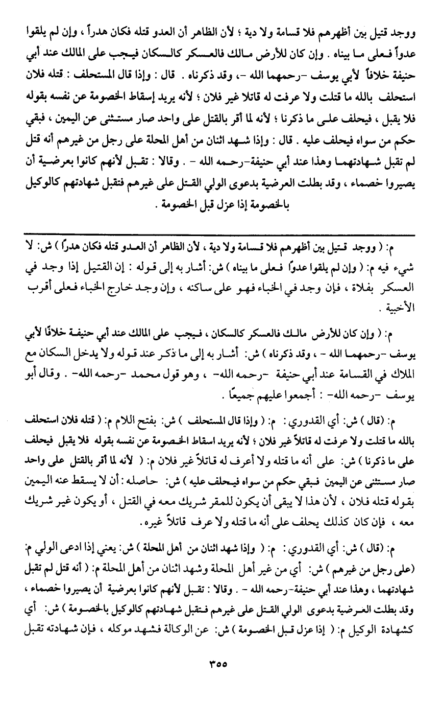 ووجد قتيل بين أظهرهم فلا قسامة ولا دية، لأن الظاهر أن العدو قتله فكان هدرا، وإن لم يلقوا عدوا فعلى ما بيناه. وإن كان للأرض مالك فالعسكر كالسكان فيجب على المالك عند أبي حنيفة خلافا لأبي يوسف - رحمهما الله - وقد ذكرناه. قال: وإذا قال المستحلف: قتله فلان استحلف بالله ما قتلت ولا عرفت له قاتلا غير فلان؛ لأنه يريد إسقاط الخصومة عن نفسه بقوله فلا يقبل، فيحلف على ما ذكرنا؛ لأنه لما أقر بالقتل على واحد صار مستثنى عن اليمين، فبقي حكم من سواه فيحلف عليه. قال: وإذا شهد اثنان من أهل المحلة على رجل من غيرهم أنه قتل لم تقبل شهادتهما وهذا عند أبي حنيفة - رَحِمَهُ اللَّهُ -. وقالا: تقبل لأنهم كانوا بعرضية أن يصيروا خصماء، وقد بطلت العرضية بدعوى الولي القتل على غيرهم فتقبل شهادتهم كالوكيل بالخصومة إذا عزل قبل الخصومة.