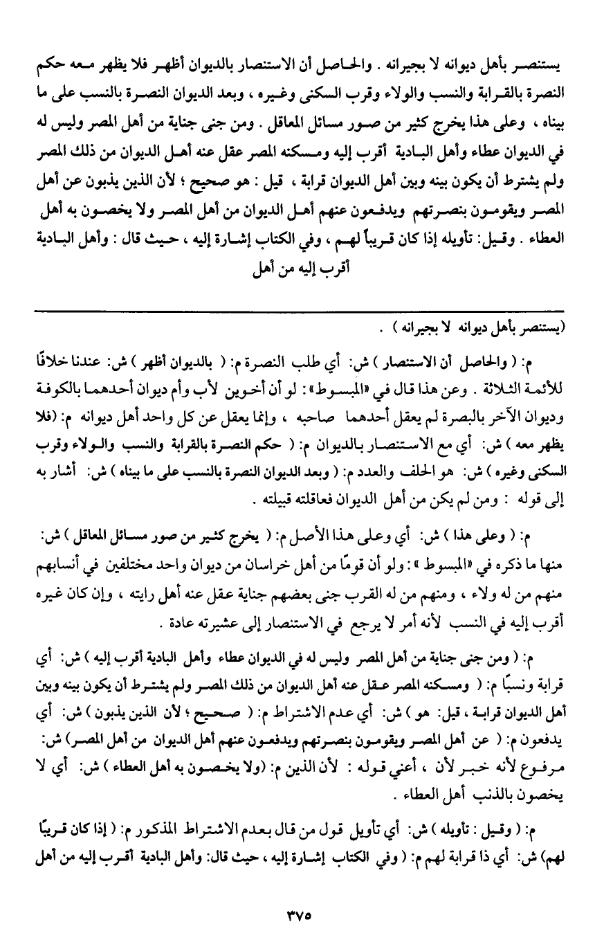 يستنصر بأهل ديوانه لا بجيرانه. والحاصل أن الاستنصار بالديوان أظهر فلا يظهر معه حكم النصرة بالقرابة والنسب والولاء وقرب السكنى وغيره، وبعد الديوان النصرة بالنسب على ما بيناه، وعلى هذا يخرج كثير من صور مسائل المعاقل.