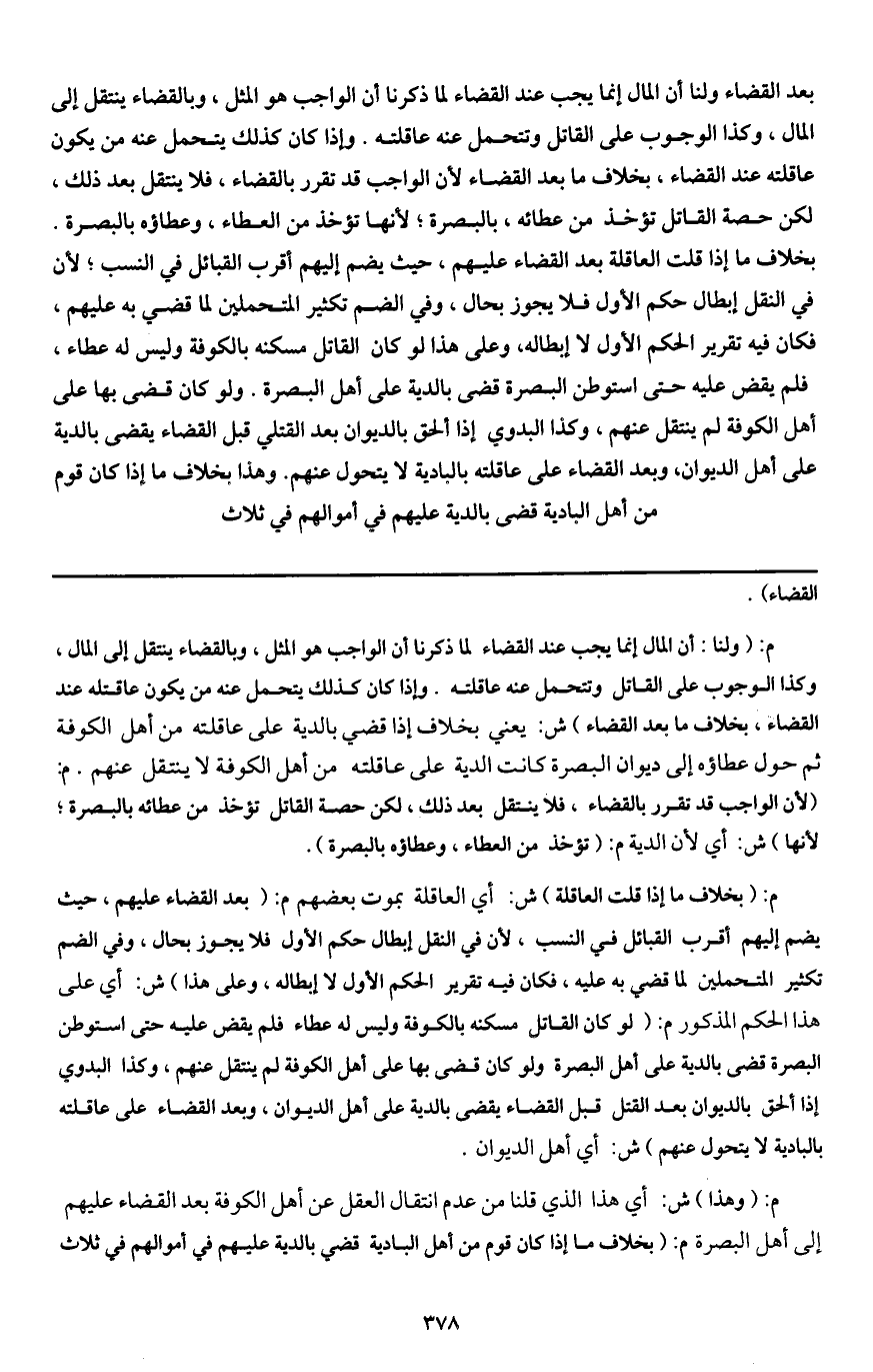 بعد القضاء ولنا أن المال إنما يجب عند القضاء لما ذكرنا أن الواجب هو المثل، وبالقضاء ينتقل إلى المال، وكذا الوجوب على القاتل وتتحمل عنه عاقلته. وإذا كان كذلك يتحمل عنه من يكون عاقلته عند القضاء، بخلاف ما بعد القضاء لأن الواجب قد تقرر بالقضاء، فلا ينتقل بعد ذلك، لكن حصة القاتل تؤخذ من عطائه بالبصرة؛ لأنها تؤخذ من العطاء، وعطاؤه بالبصرة. بخلاف ما إذا قلت العاقلة بعد القضاء عليهم، حيث يضم إليهم أقرب القبائل في النسب؛ لأن في النقل إبطال حكم الأول فلا يجوز بحال، وفي الضم تكثير المتحملين لما قضي به عليهم، فكان فيه تقرير الحكم الأول لا إبطاله، وعلى هذا لو كان القاتل مسكنه بالكوفة وليس له عطاء، فلم يقض عليه حتى استوطن البصرة قضى بالدية على أهل البصرة. ولو كان قضى بها على أهل الكوفة لم ينتقل عنهم، وكذا البدوي إذا ألحق بالديوان بعد القتلى قبل القضاء يقضى بالدية على أهل الديوان، وبعد القضاء على عاقلته بالبادية لا يتحول عنهم. وهذا بخلاف ما إذا كان قوم من أهل البادية قضى بالدية عليهم في أموالهم في ثلاث