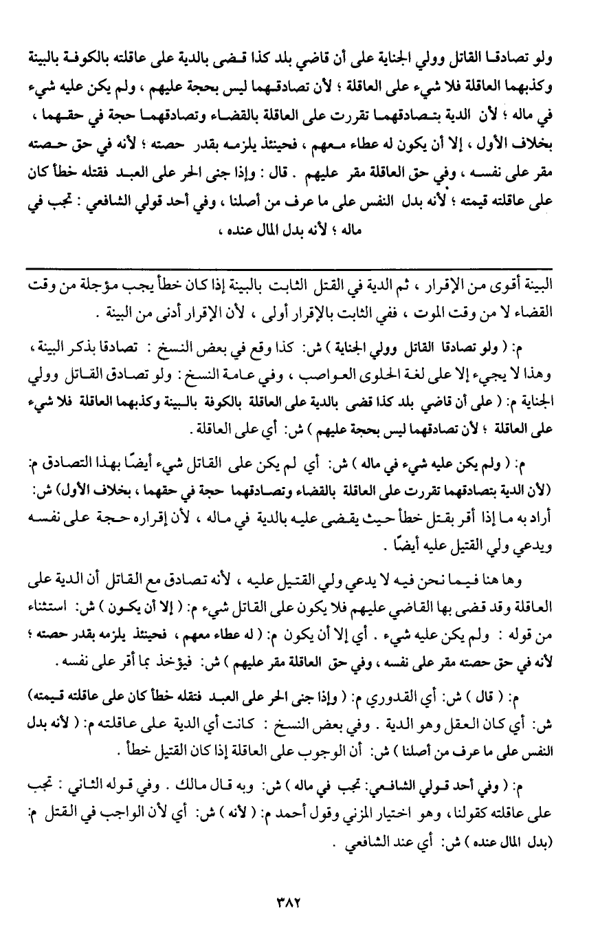 م: (ولم يكن عليه شيء في ماله) ش: أي لم يكن على القاتل شيء أيضًا بهذا التصادق م: (لأن الدية بتصادقهما تقررت على العاقلة بالقضاء وتصادقهما حجة في حقهما، بخلاف الأول) ش: أراد به ما إذا أقر بقتل خطأ حيث يقضى عليه بالدية في ماله، لأن إقراره حجة على نفسه، ويدعي ولي القتيل عليه أيضًا.