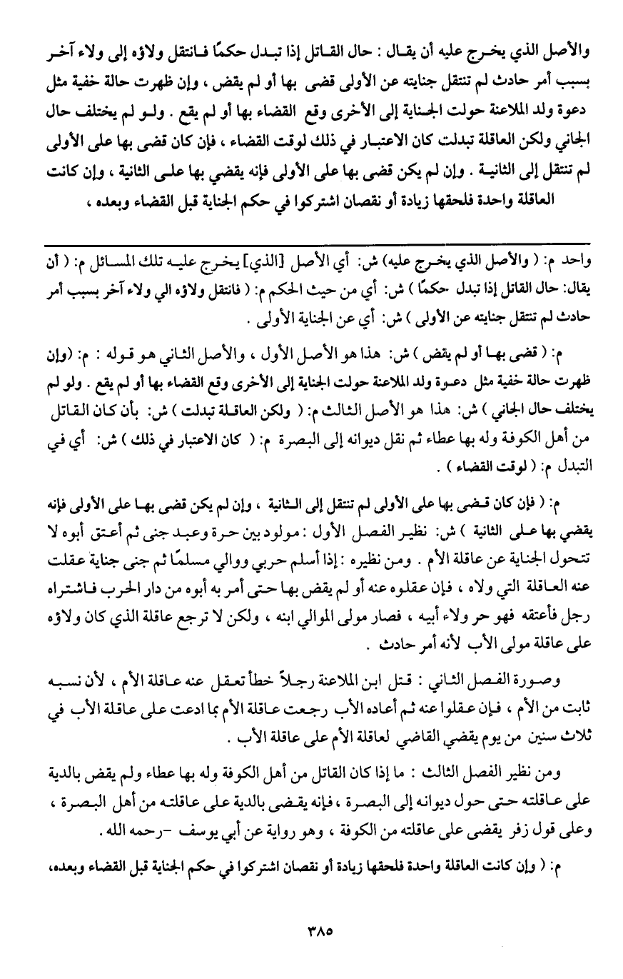 ومن نظير الفصل الثالث: ما إذا كان القاتل من أهل الكوفة وله بها عطاء ولم يقض بالدية على عاقلته حتى حول ديوانه إلى البصرة، فإنه يقضى بالدية على عاقلته من أهل البصرة، وعلى قول زفر يقضى على عاقلته من الكوفة، وهو رواية عن أبي يوسف - رَحِمَهُ اللَّهُ -.