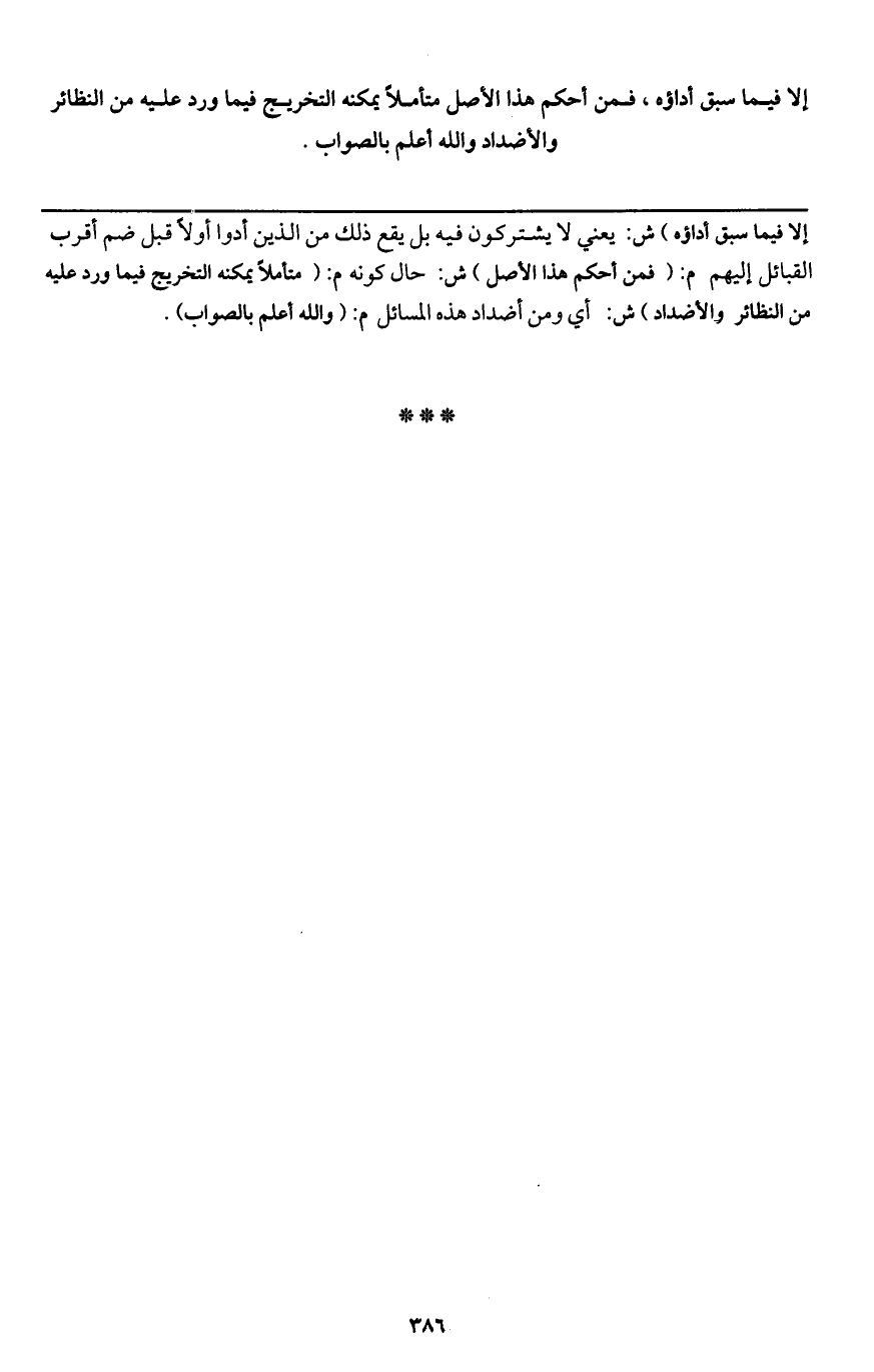 ـــــــــــــــــــــــــــــQإلا فيما سبق أداؤه) ش: يعني لا يشتركون فيه بل يقع ذلك من الذين أدوا أولا قبل ضم أقرب القبائل إليهم م: (فمن أحكم هذا الأصل) ش: حال كونه م: (متأملا يمكنه التخريج فيما ورد عليه من النظائر والأضداد) ش: أي ومن أضداد هذه المسائل م: (والله أعلم بالصواب) .