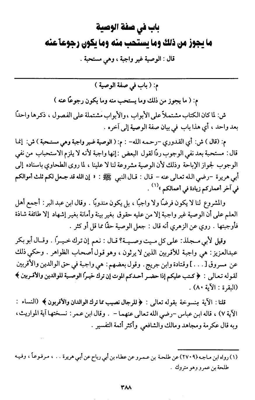 باب في صفة الوصية ما يجوز من ذلك وما يستحب منه وما يكون رجوعا عنه قال: الوصية غير واجبة، وهي مستحبة.