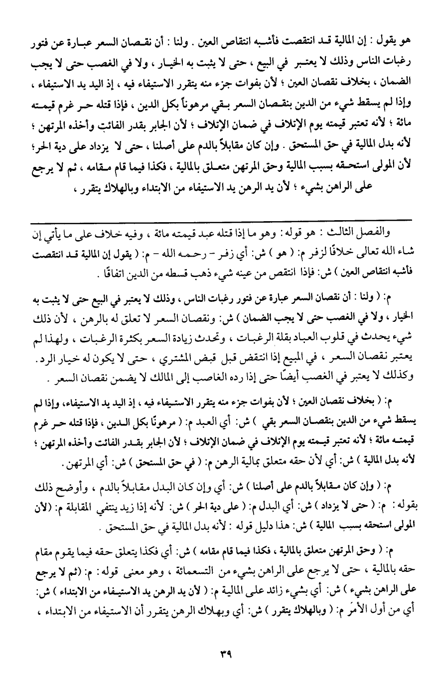 هو يقول: إن المالية قد انتقصت فأشبه انتقاص العين. ولنا: أن نقصان السعر عبارة عن فتور رغبات الناس وذلك لا يعتبر في البيع، حتى لا يثبت به الخيار، ولا في الغصب حتى لا يجب الضمان، بخلاف نقصان العين؛ لأن بفوات جزء منه يتقرر الاستيفاء فيه، إذ اليد يد الاستيفاء، وإذا لم يسقط شيء من الدين بنقصان السعر بقي مرهونا بكل الدين، فإذا قتله حر غرم قيمته مائة؛ لأنه تعتبر قيمته يوم الإتلاف في ضمان الإتلاف؛ لأن الجابر بقدر الفائت وأخذه المرتهن؛ لأنه بدل المالية في حق المستحق. وإن كان مقابلا بالدم على أصلنا، حتى لا يزداد على دية الحر؛ لأن المولى استحقه بسبب المالية وحق المرتهن متعلق بالمالية، فكذا فيما قام مقامه، ثم لا يرجع على الراهن بشيء: لأن يد الرهن يد الاستيفاء من الابتداء وبالهلاك يتقرر،
