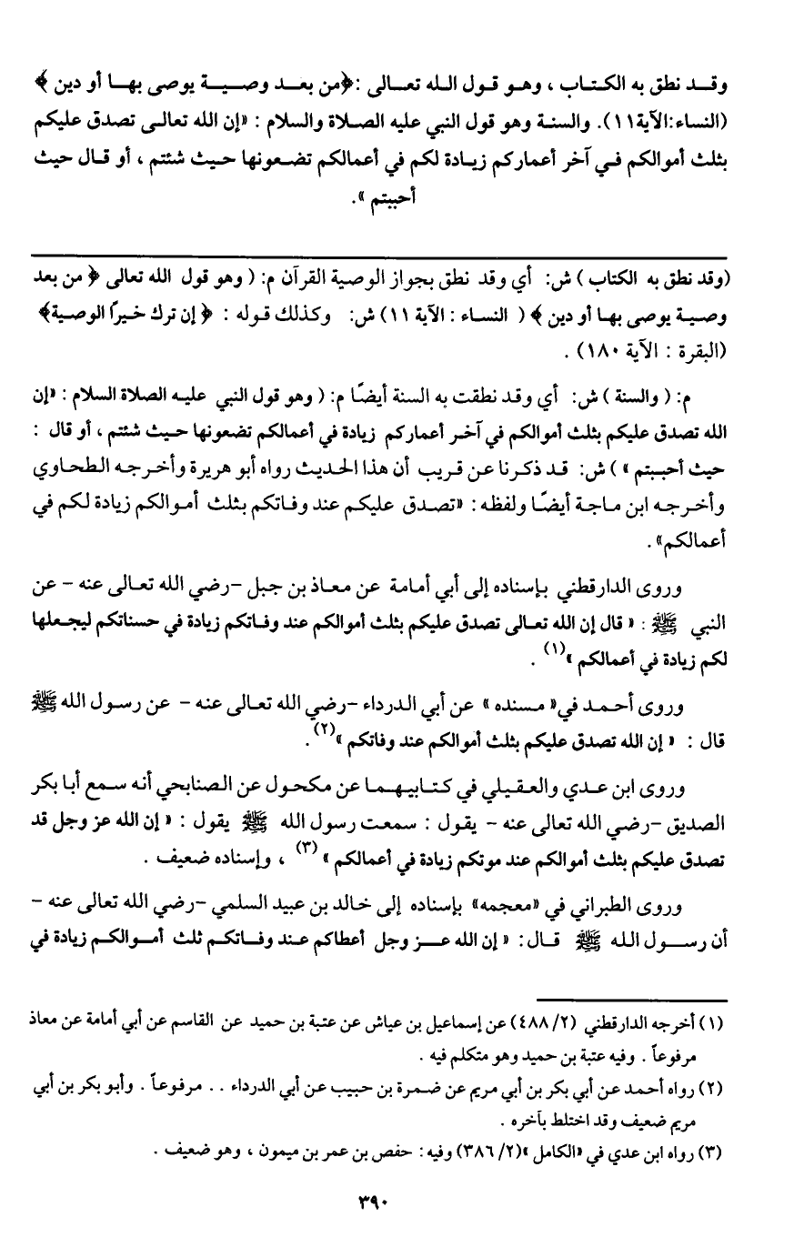 وروى الدارقطني بإسناده إلى أبي أمامة عن معاذ بن جبل - رَضِيَ اللَّهُ تَعَالَى عَنْهُ - عن النبي - صَلَّى اللَّهُ عَلَيْهِ وَسَلَّمَ -: «قال إن الله تعالى تصدق عليكم بثلث أموالكم عند وفاتكم زيادة في حسناتكم ليجعلها لكم زيادة في أعمالكم» .