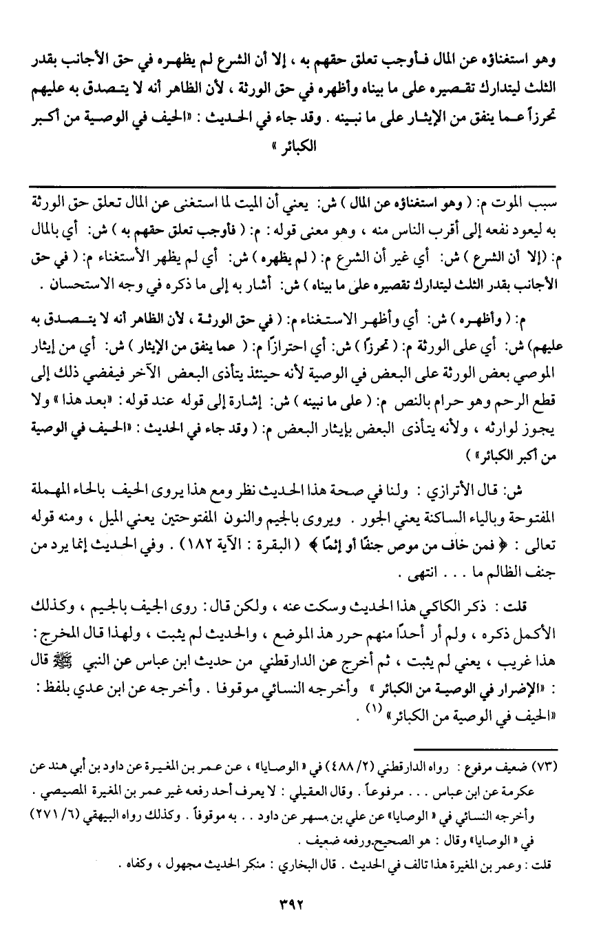 م: (وأظهره) ش: أي وأظهر الاستغناء م: (في حق الورثة؛ لأن الظاهر أنه لا يتصدق به عليهم) ش: أي على الورثة م: (تحرزا) ش: أي احترازا م: (عما ينفق من الإيثار) ش: أي من إيثار الموصي بعض الورثة على البعض في الوصية لأنه حينئذ يتأذى البعض الآخر فيفضي ذلك إلى قطع الرحم وهو حرام بالنص م: (على ما نبينه) ش: إشارة إلى قوله عند قوله: " بعد هذا " ولا يجوز لوارثه، ولأنه يتأذى البعض بإيثار البعض م: (وقد جاء في الحديث: «الحيف في الوصية من أكبر الكبائر» ش: قال الأترازي: ولنا في صحة هذا الحديث نظر ومع هذا يروى الحيف بالحاء المهملة المفتوحة وبالياء الساكنة يعني الجور. ويروى بالجيم والنون المفتوحتين يعني الميل، ومنه قَوْله تَعَالَى: {فَمَنْ خَافَ مِنْ مُوصٍ جَنَفًا أَوْ إِثْمًا} [البقرة: 182] (البقرة: الآية 182) . وفي الحديث إنما يرد من جنف الظالم ما ... انتهى.