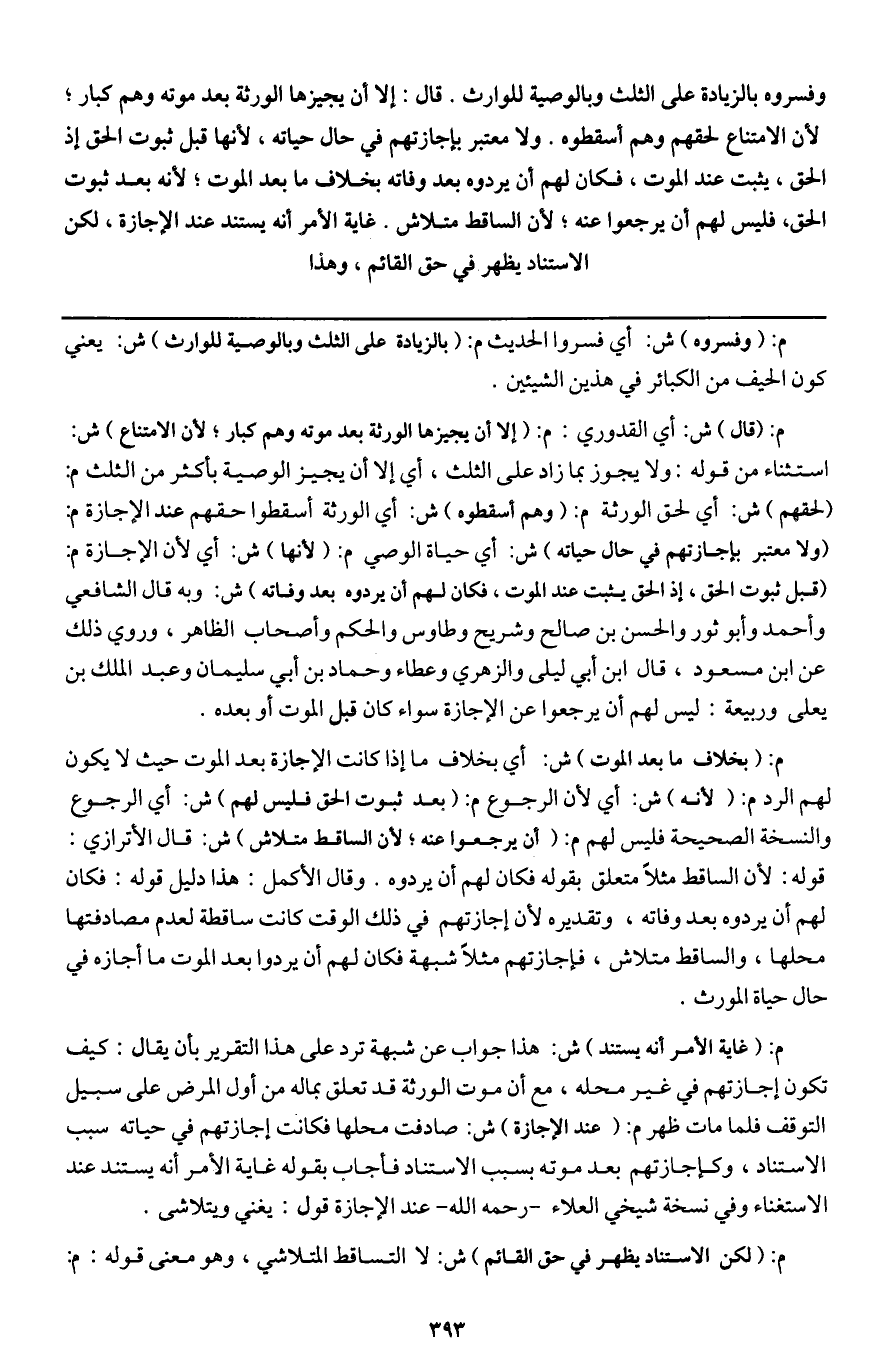 م: (قال) ش: أي القدوري: م: (إلا أن يجيزها الورثة بعد موته وهم كبار؛ لأن الامتناع) ش: استثناء من قوله: ولا يجوز بما زاد على الثلث، أي إلا أن يجيز الوصية بأكثر من الثلث م: (لحقهم) ش: أي لحق الورثة م: (وهم أسقطوه) ش: أي الورثة أسقطوا حقهم عند الإجازة م: (ولا معتبر بإجازتهم في حال حياته) ش: أي حياة الوصي م: (لأنها) ش: أي لأن الإجازة م: (قبل ثبوت الحق، إذ الحق يثبت عند الموت، فكان لهم أن يردوه بعد وفاته) ش: وبه قال الشافعي وأحمد وأبو ثور والحسن بن صالح وشريح وطاوس والحكم وأصحاب الظاهر، وروي ذلك عن ابن مسعود، قال ابن أبي ليلى والزهري وعطاء وحماد بن أبي سليمان وعبد الملك بن يعلى وربيعة: ليس لهم أن يرجعوا عن الإجازة سواء كان قبل الموت أو بعده.