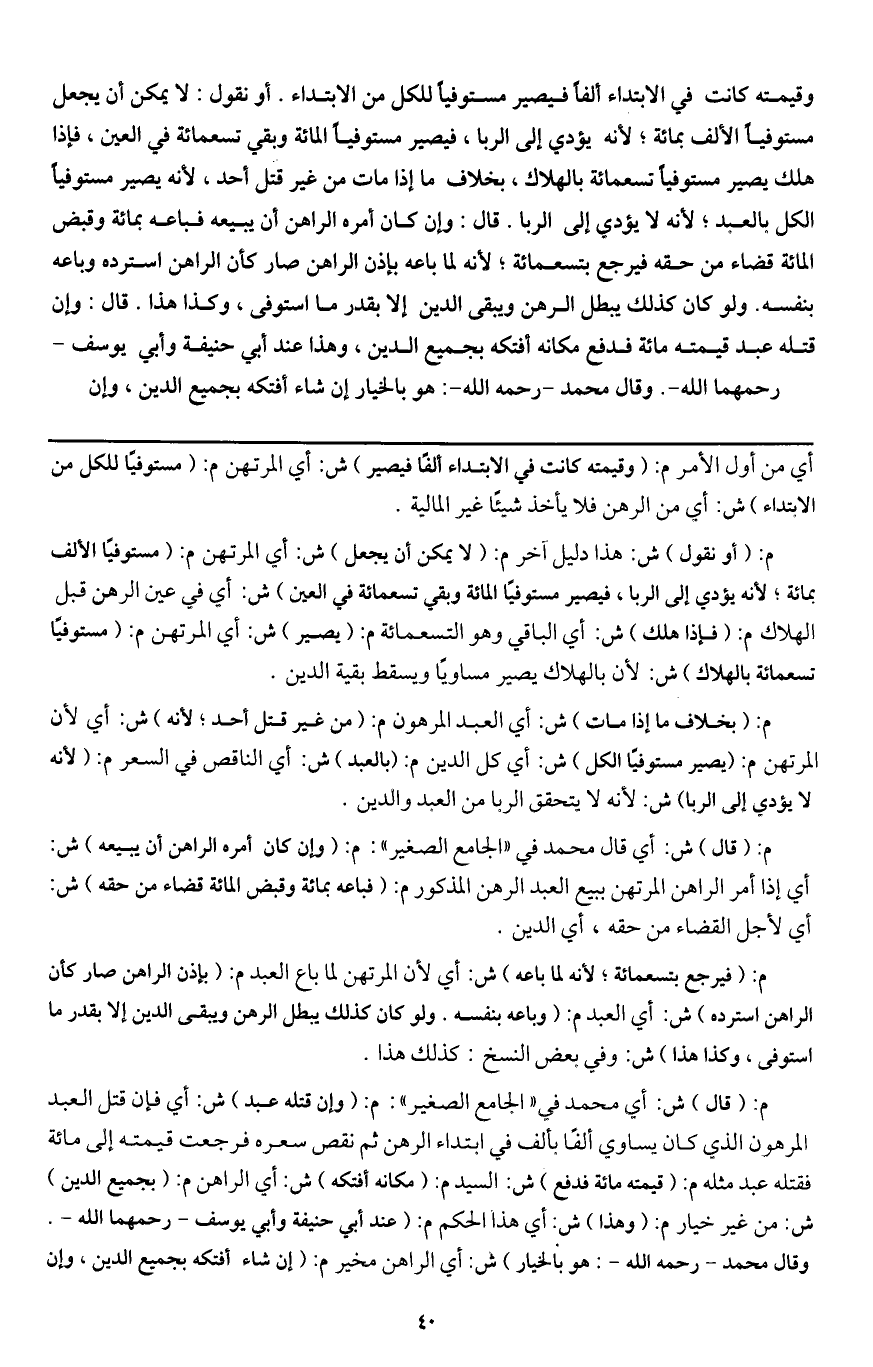 وقيمته كانت في الابتداء ألفا فيصير مستوفيا للكل من الابتداء. أو نقول: لا يمكن أن يجعل مستوفيا الألف بمائة؛ لأنه يؤدي إلى الربا، فيصير مستوفيا المائة وبقي تسعمائة في العين، فإذا هلك يصير مستوفيا تسعمائة بالهلاك، بخلاف ما إذا مات من غير قتل أحد؛ لأنه يصير مستوفيا الكل بالعبد؛ لأنه لا يؤدي إلى الربا. قال: وإن كان أمره الراهن أن يبيعه فباعه بمائة وقبض المائة قضاء من حقه فيرجع بتسعمائة؛ لأنه لما باعه بإذن الراهن صار كأن الراهن استرده وباعه بنفسه. ولو كان كذلك يبطل الرهن ويبقى الدين إلا بقدر ما استوفى، وكذا هذا. قال: وإن قتله عبد قيمته مائة فدفع مكانه أفتكه بجميع الدين، وهذا عند أبي حنيفة وأبي يوسف - رحمهما الله -. وقال محمد - رَحِمَهُ اللَّهُ -: هو بالخيار إن شاء أفتكه بجميع الدين، وإن