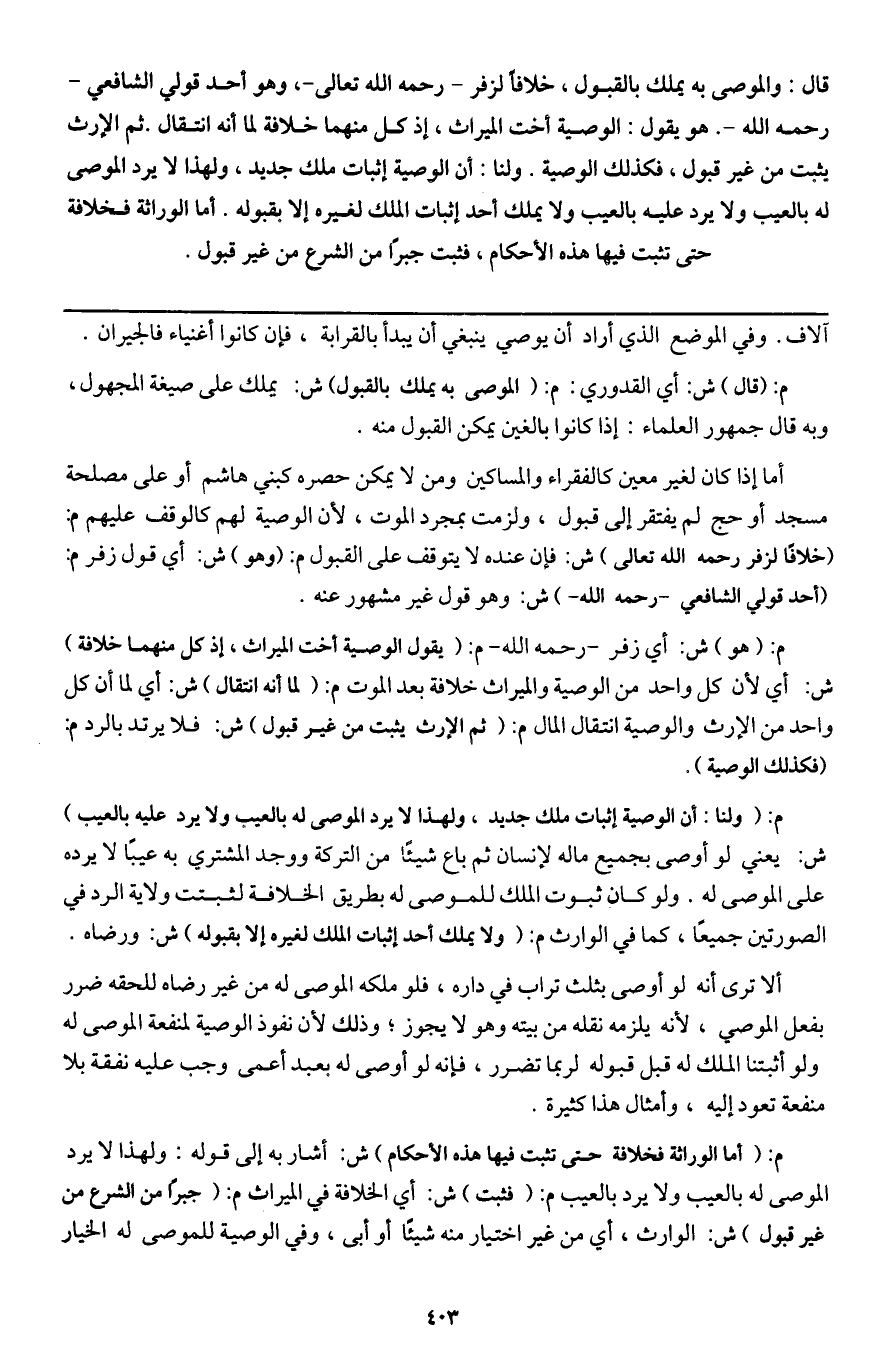 أما إذا كان لغير معين كالفقراء والمساكين ومن لا يمكن حصره كبني هاشم أو على مصلحة مسجد أو حج لم يفتقر إلى قبول، ولزمت بمجرد الموت؛ لأن الوصية لهم كالوقف عليهم م: (خلافا لزفر - رَحِمَهُ اللَّهُ تَعَالَى -) ش: فإن عنده لا يتوقف على القبول م: (وهو) ش: أي قول زفر م: (أحد قولي الشافعي - رَحِمَهُ اللَّهُ -) ش: وهو قول غير مشهور عنه.