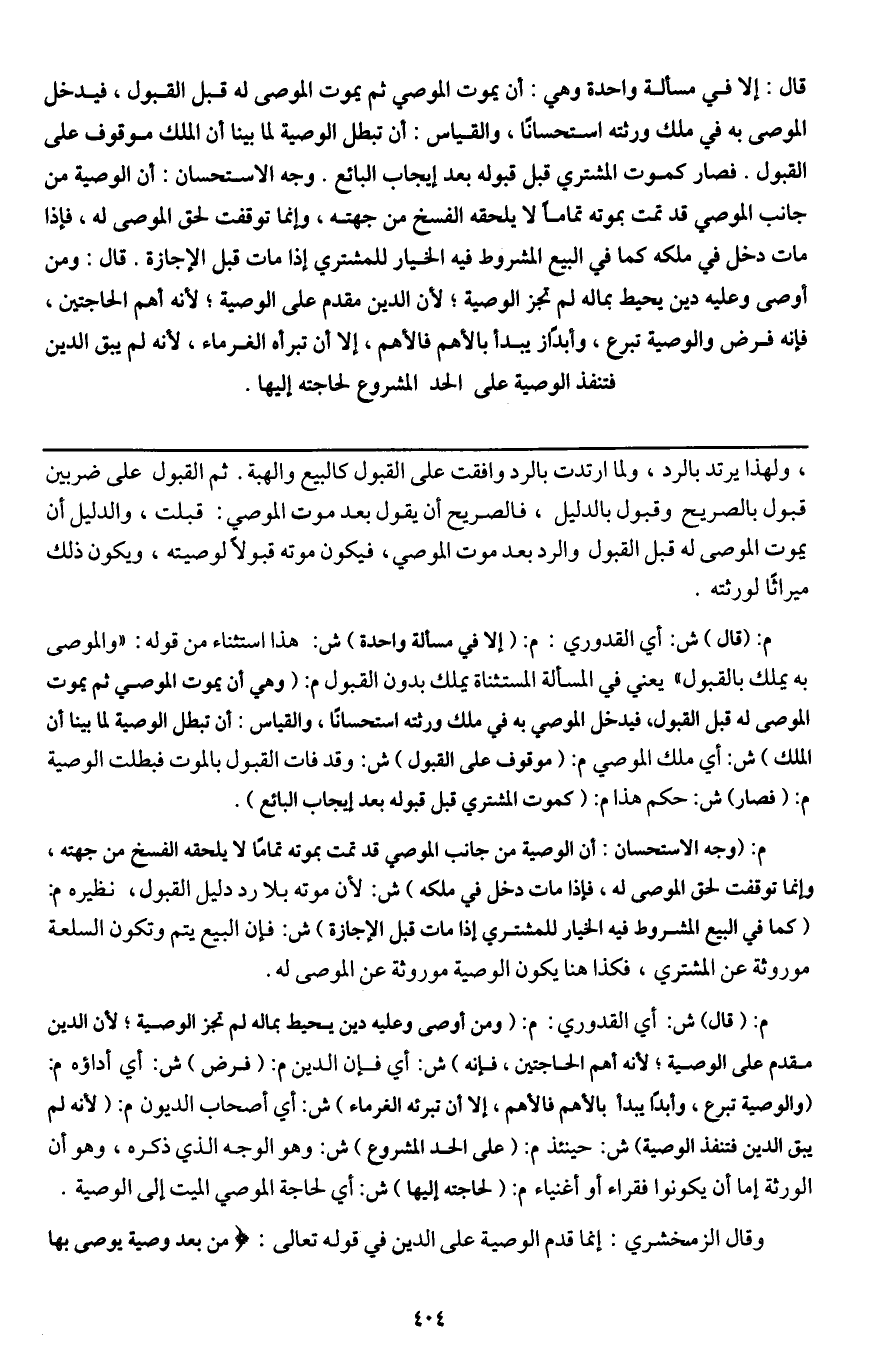 ـــــــــــــــــــــــــــــQ، ولهذا يرتد بالرد، ولما ارتدت بالرد وافقت على القبول كالبيع والهبة. ثم القبول على ضربين قبول بالصريح وقبول بالدليل، فالصريح أن يقول بعد موت الموصي: قبلت، والدليل أن يموت الموصى له قبل القبول والرد بعد موت الموصي، فيكون موته قبولا لوصيته، ويكون ذلك ميراثا لورثته.