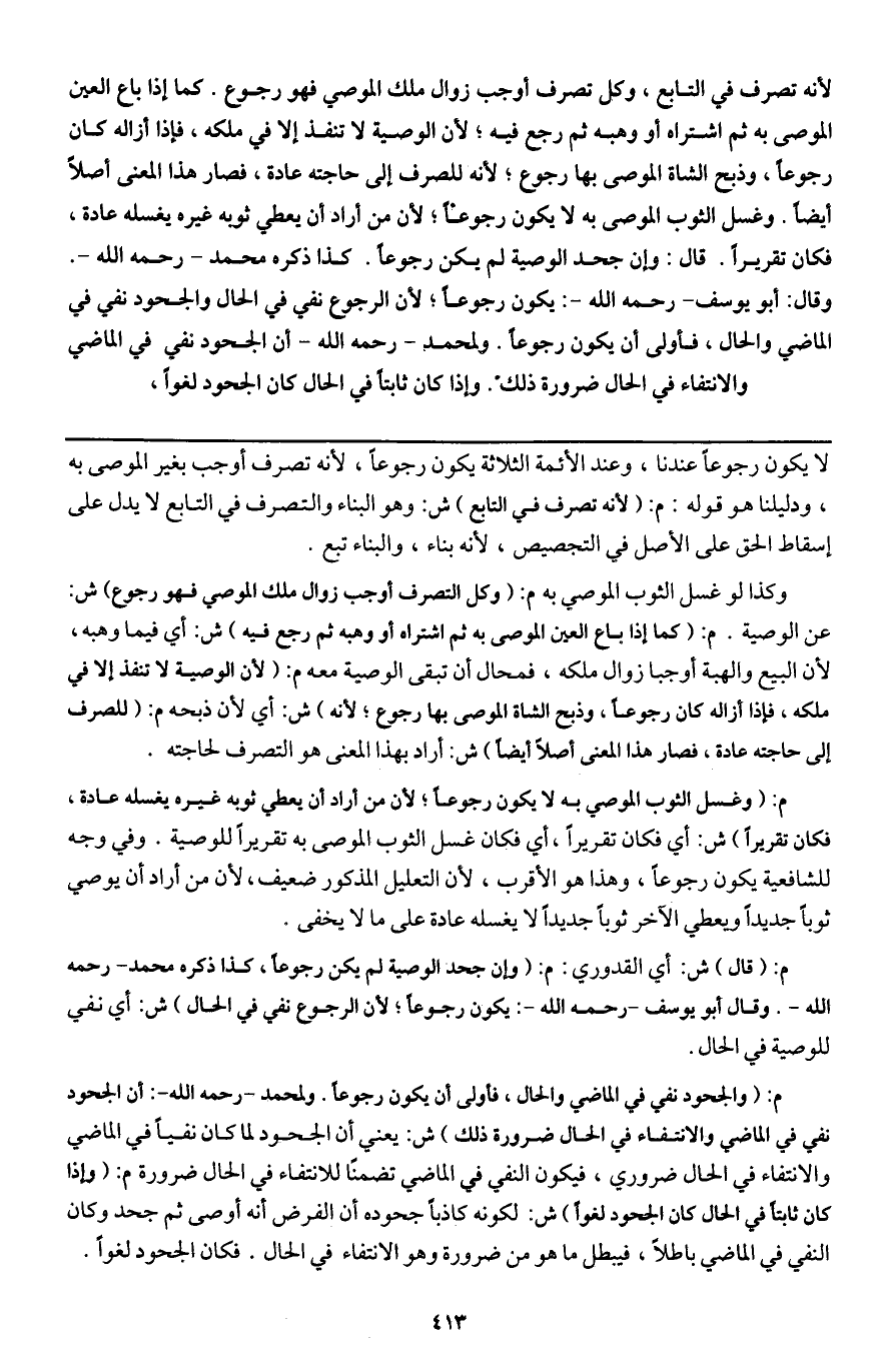 لأنه تصرف في التابع، وكل تصرف أوجب زوال ملك الموصي فهو رجوع. كما إذا باع العين الموصى به ثم اشتراه أو وهبه ثم رجع فيه؛ لأن الوصية لا تنفذ إلا في ملكه، فإذا أزاله كان رجوعا، وذبح الشاة الموصى بها رجوع؛ لأنه للصرف إلى حاجته عادة، فصار هذا المعنى أصلا أيضا. وغسل الثوب الموصى به لا يكون رجوعا؛ لأن من أراد أن يعطي ثوبه غيره يغسله عادة، فكان تقريرا. قال: وإن جحد الوصية لم يكن رجوعا. كذا ذكره محمد - رَحِمَهُ اللَّهُ -. وقال: أبو يوسف - رَحِمَهُ اللَّهُ -: يكون رجوعا؛ لأن الرجوع نفي في الحال والجحود نفي في الماضي والحال، فأولى أن يكون رجوعا. ولمحمد - رَحِمَهُ اللَّهُ - أن الجحود نفي في الماضي والانتفاء في الحال ضرورة ذلك. وإذا كان ثابتا في الحال كان الجحود لغوا ,