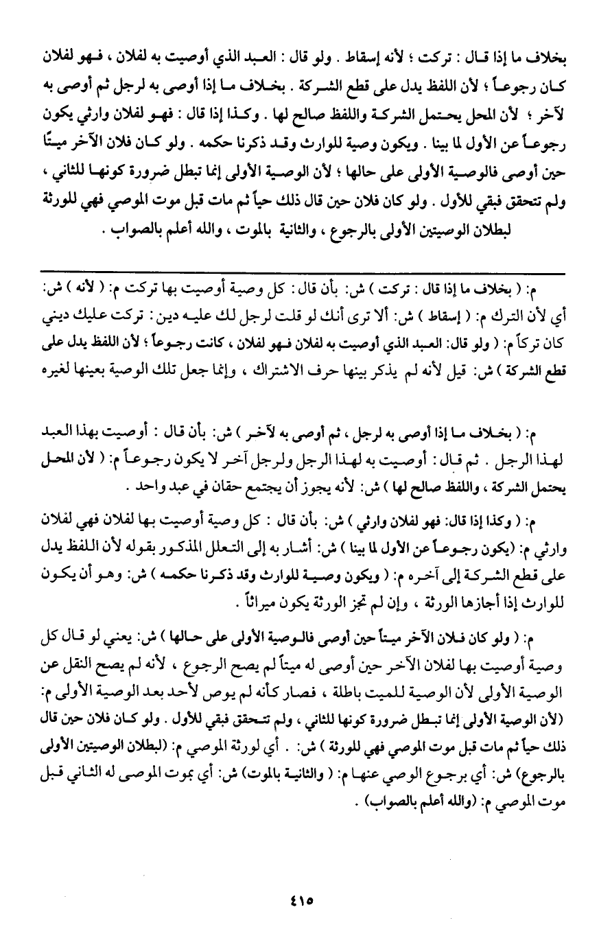 بخلاف ما إذا قال: تركت؛ لأنه إسقاط. ولو قال: العبد الذي أوصيت به لفلان، فهو لفلان كان رجوعا؛ لأن اللفظ يدل على قطع الشركة. بخلاف ما إذا أوصى به لرجل ثم أوصى به لآخر؛ لأن المحل يحتمل الشركة واللفظ صالح لها. وكذا إذا قال: فهو لفلان وارثي يكون رجوعا عن الأول لما بينا. ويكون وصية للوارث وقد ذكرنا حكمه. ولو كان فلان الآخر ميتا حين أوصى فالوصية الأولى على حالها؛ لأن الوصية الأولى إنما تبطل ضرورة كونها للثاني، ولم تتحقق فبقي للأول. ولو كان فلان حين قال ذلك حيا ثم مات قبل موت الموصي فهي للورثة لبطلان الوصيتين الأولى بالرجوع، والثانية بالموت، والله أعلم بالصواب.
